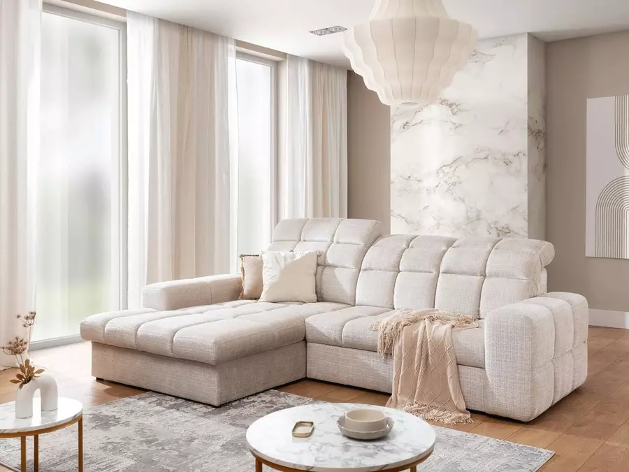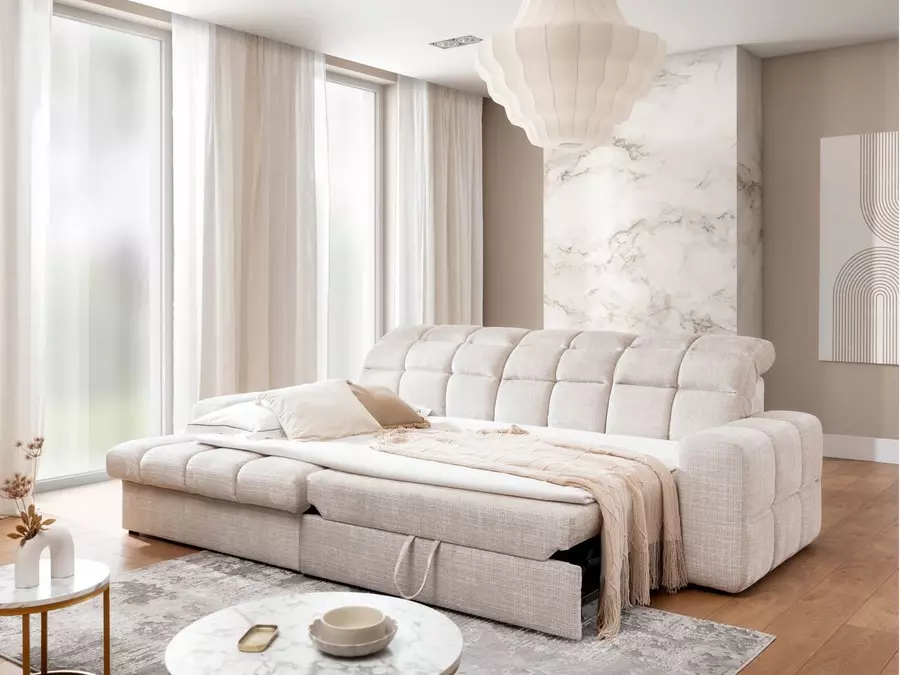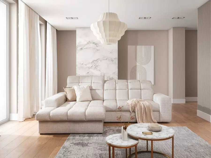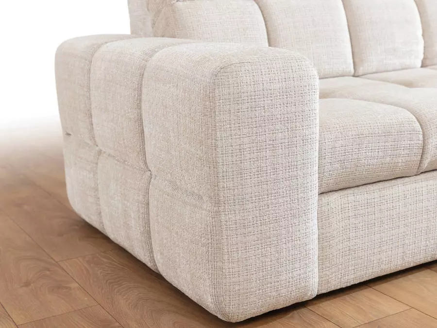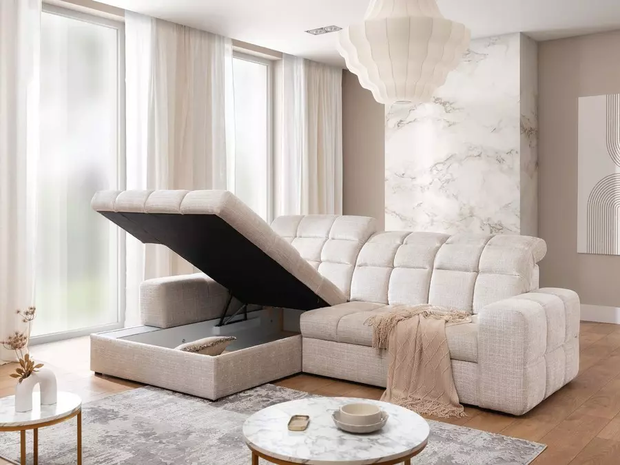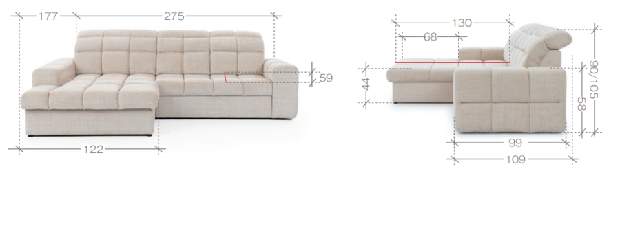 Ъглов диван ЛУГО S с функция сън тип ДЕЛФИН и ракла. Размер на площта за спане: 215х128 см. Широчина на лежанката:122 см. Широчина на подлакътника:99 см. Височина на седалката:44 см. Дълбочина на седалката:59 см. Височина на краката:2.5 см.