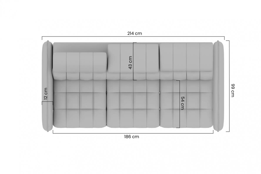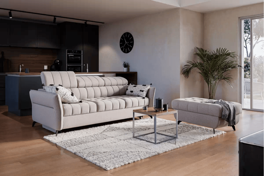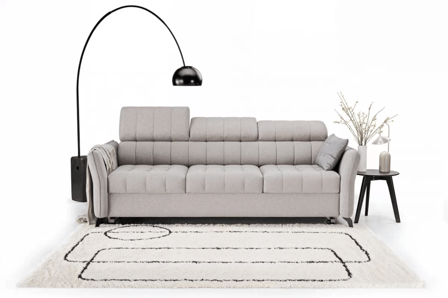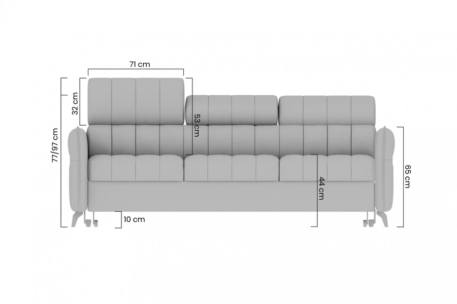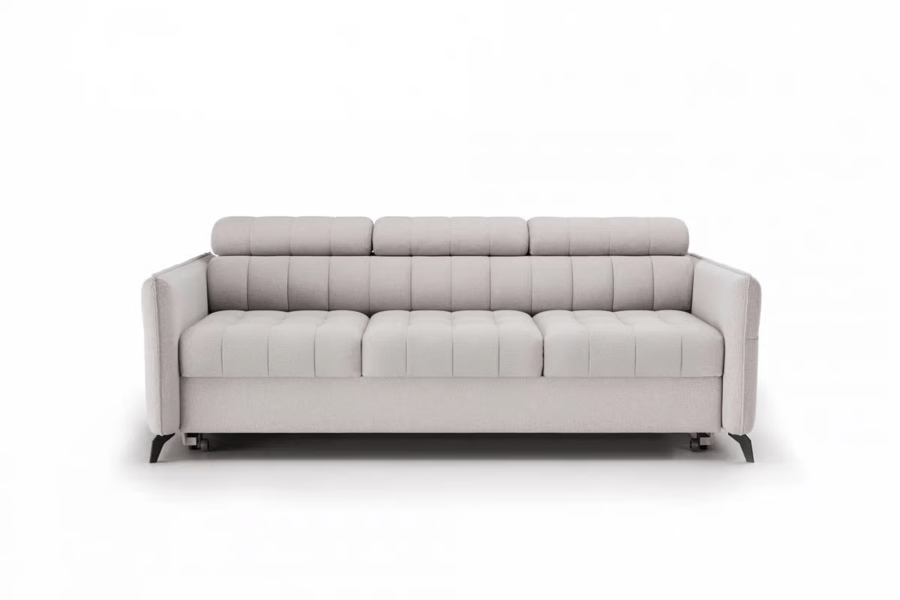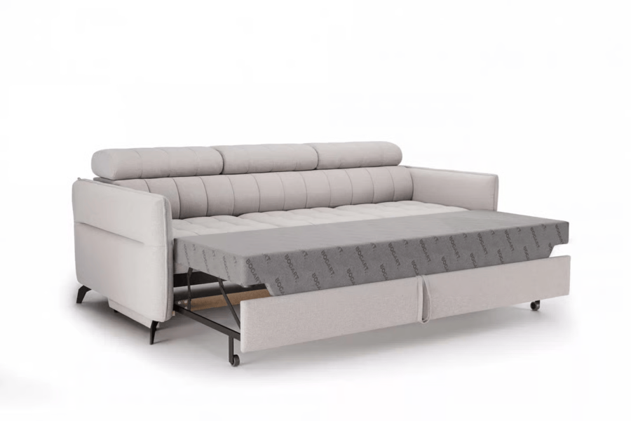 Диванът разполага с функция сън с площ 186 x 124 см – подходяща както за отдих през деня, така и за удобна нощувка, когато е необходимо. Подглавниците се регулират на пет степени, което позволява индивидуално настройване според предпочитаната позиция за почивка, четене или гледане на телевизия.