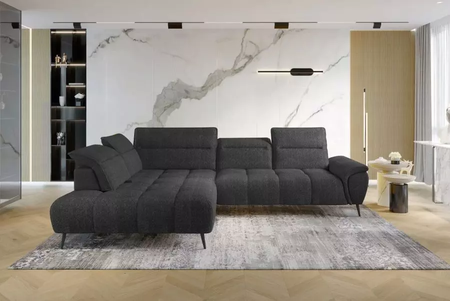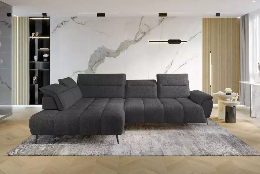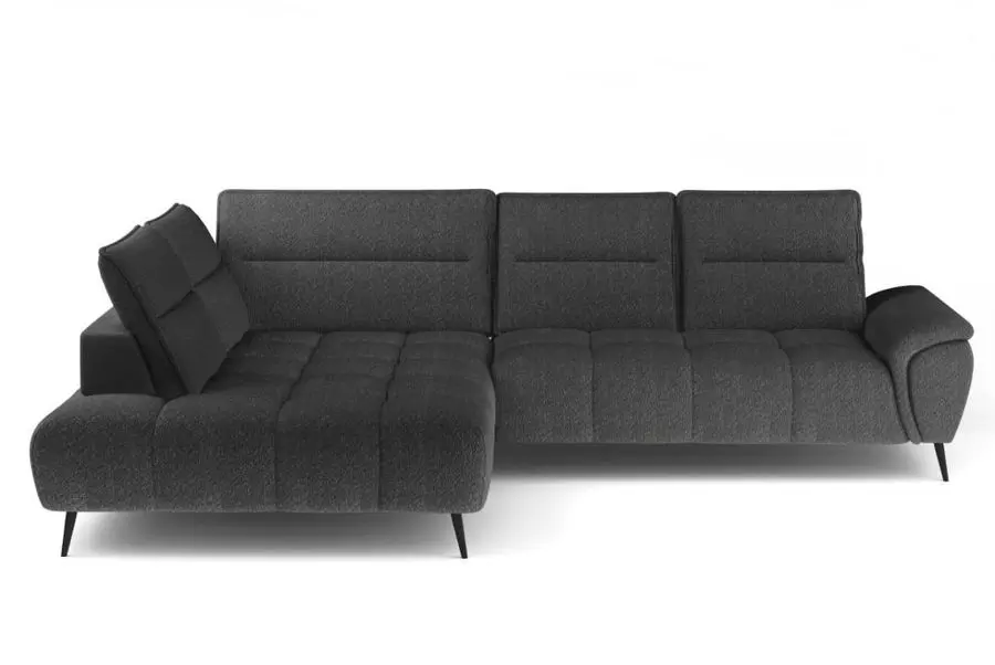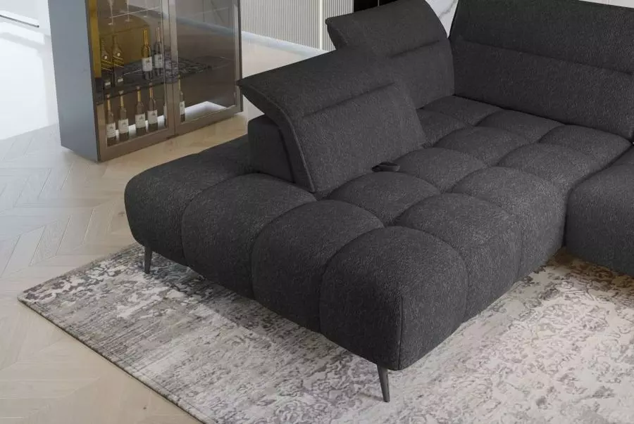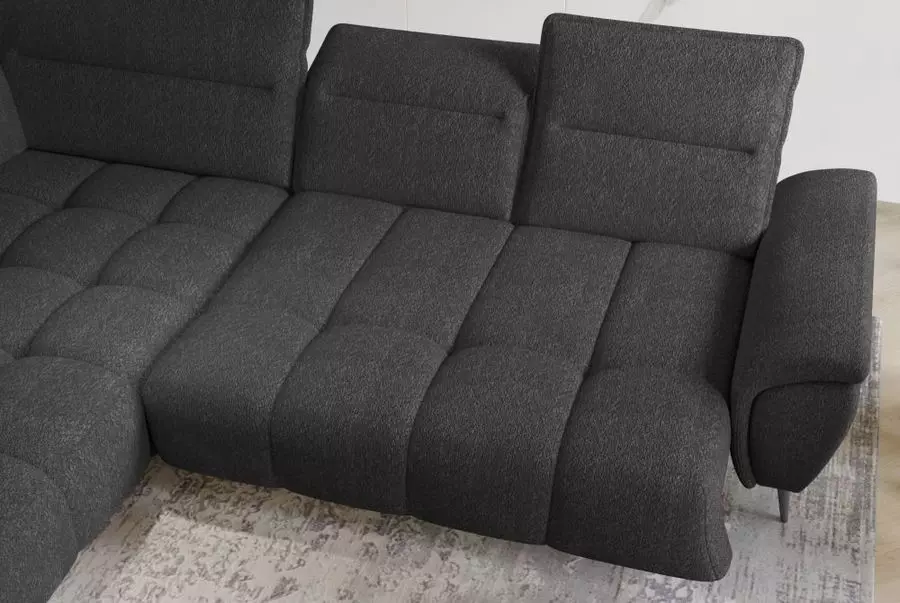 Ъглов диван МОНТАНА във вариант L с функция за електрическо регулиране на дълбочината на седалката до 26 см и подвижни подглавници за комфорт на главата.