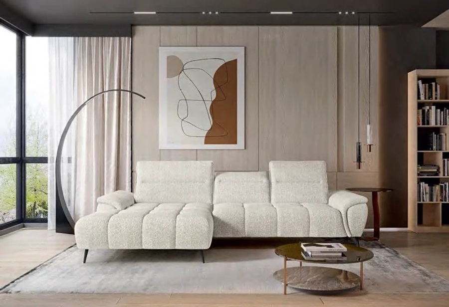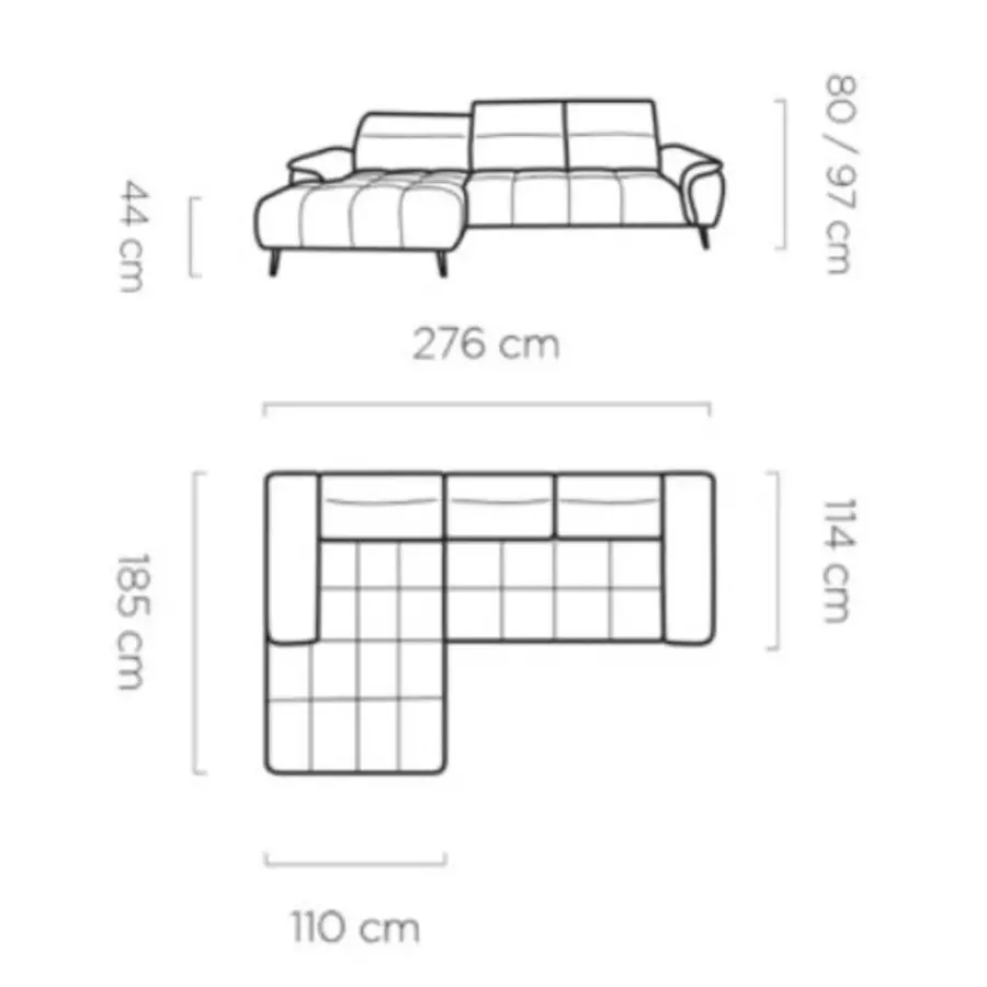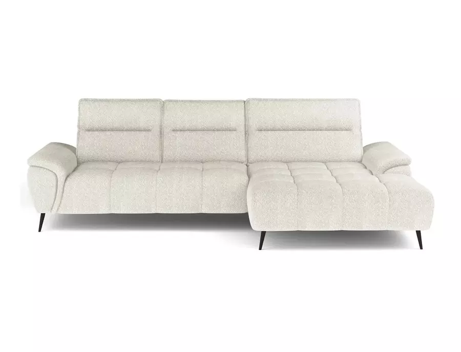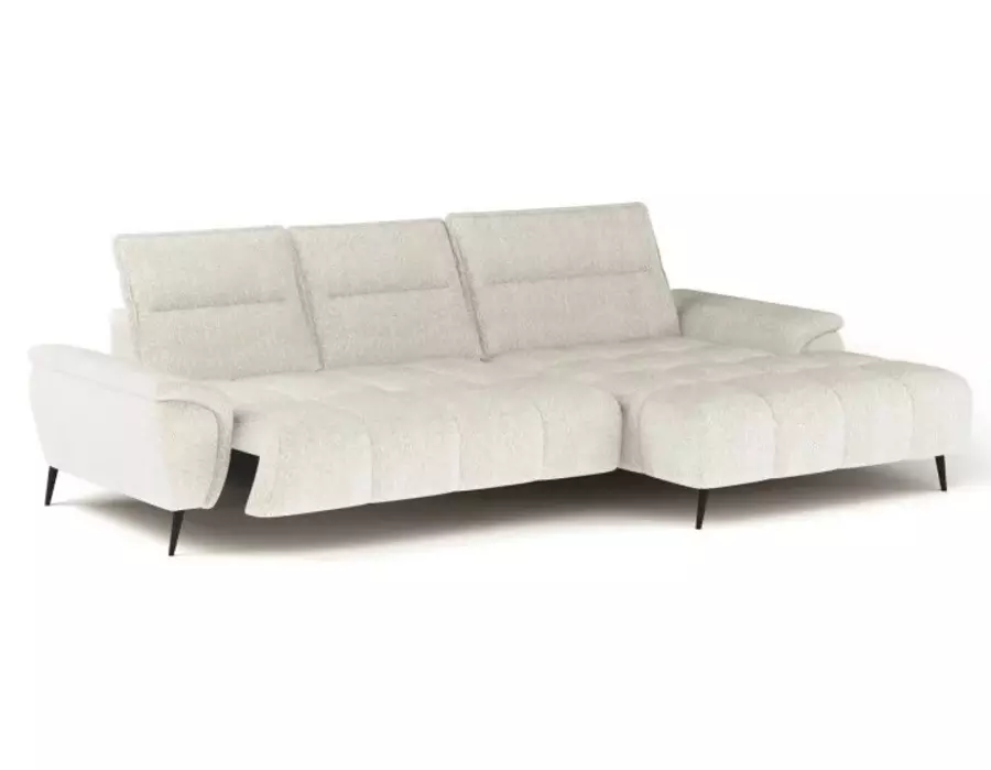 Ъглов диван МОНТАНА във вариант S с функция за електрическо регулиране на дълбочината на седалката до 26 см и подвижни подглавници за комфорт на главата.
