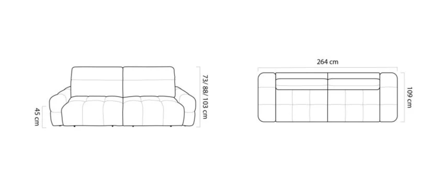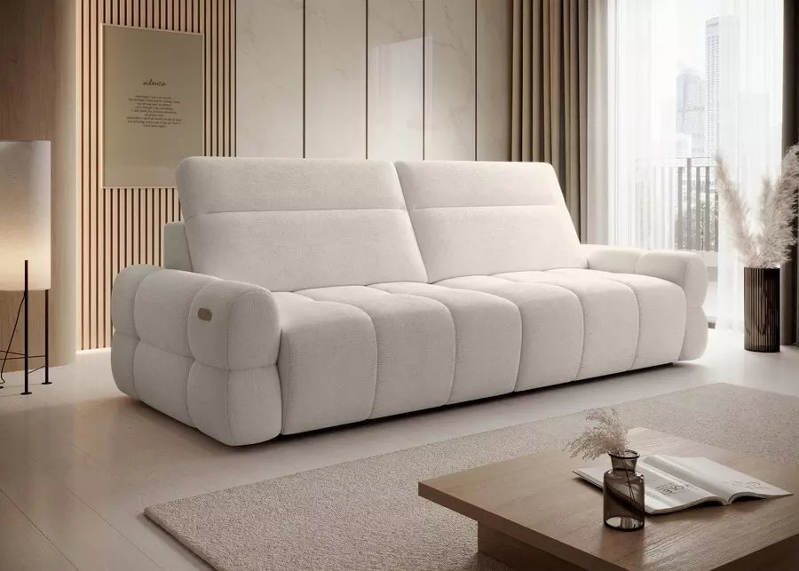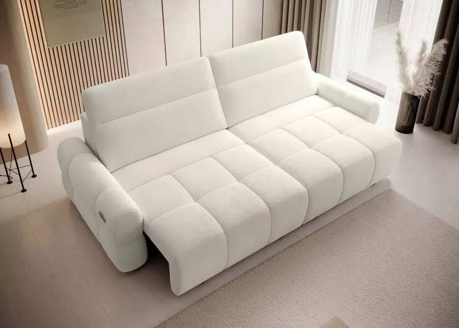 Диван МАТЕО е компактен и изключително функционален модел, който впечатлява със съвременен дизайн и интелигентни решения за комфорт. Съчетава стил и практичност, благодарение на два напълно индивидуални електрически механизма, които позволяват регулиране на дълбочината на седалката според индивидуалните предпочитания. Това дава възможност за максимално удобство при сядане и лежане, а трансформирането във функция сън с площ 216х120 см го прави идеален избор за всекидневна употреба или за гости.