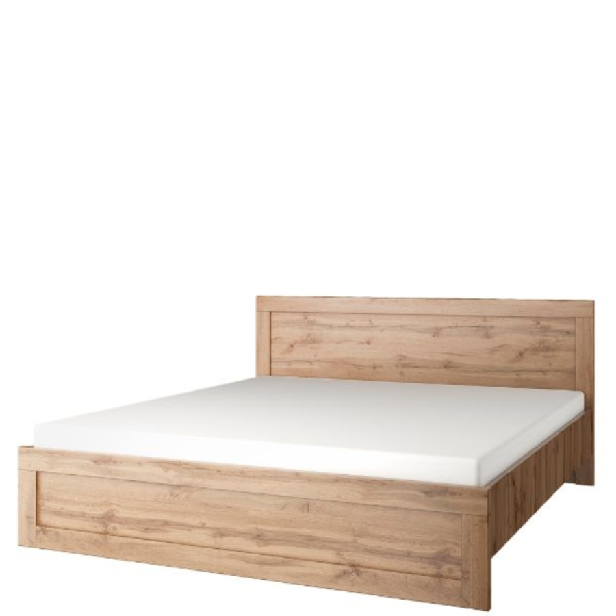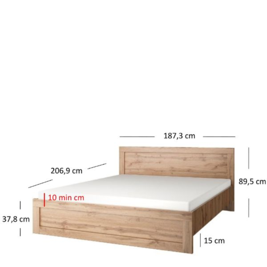 Леглото е предназначено за двулицев матрак с размер 180х200см., което го прави идеален избор за двойки или за просторни спални помещения. В комплекта е включена здрава ламелна рамка, която осигурява стабилна основа и допринася за по-добро разпределение на тежестта и по-високо ниво на комфорт по време на сън.