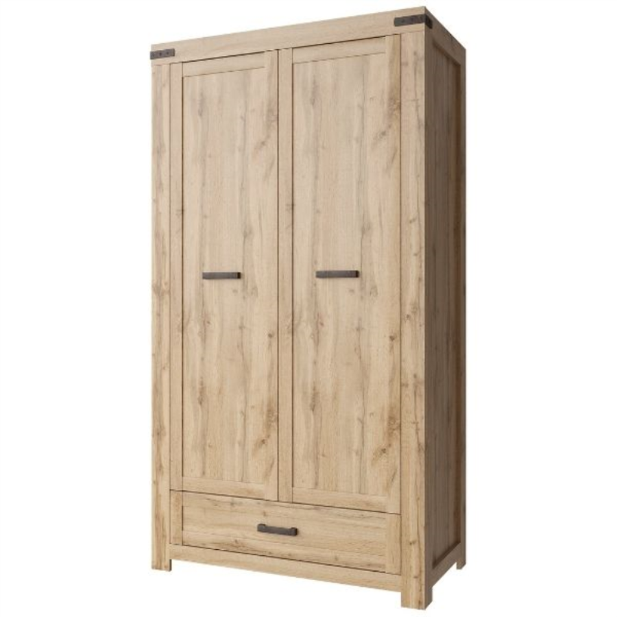 Гардеробът 2D1S от колекцията МОРТИЗ ще работи добре в стаи с не твърде голяма площ. Този практичен мебел има вдлъбнатина с прът за окачване на палта, сакета, ризи, костюми или рокли. Собственикът разполага и с един рафт и просторно чекмедже, в което лесно може да организира останалата част от гардероба и различни аксесоари. Благодарение на простата си форма и естествен цвят, гардеробът ще пасне перфектно във всеки интериор, например спалня, младежка стая и коридор. По желание се монтират ламели и фитинги, имитиращи стар метал, на предната част на шкафа, в зависимост от предпочитанията на потребителя. Собственикът може по всяко време да променя външния вид на мебелите.