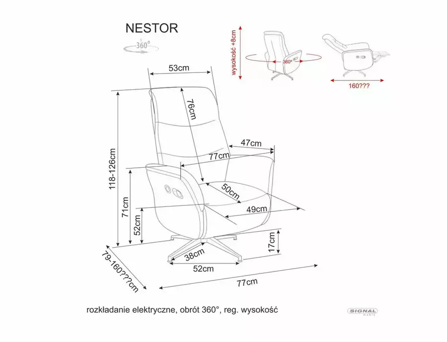 Електрическият разтегателен фотьойл НЕСТОР е с компактни размери: широчина 77 см, височина 118 см и дълбочина 50 см.