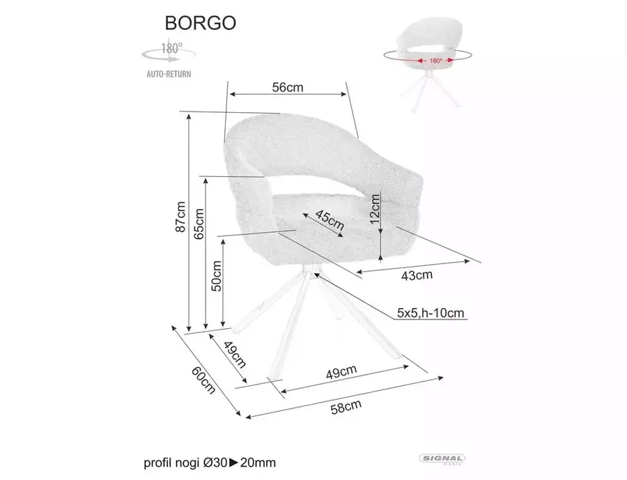 Кресло БОРГО е израз на модерен стил и комфорт, създадено да впечатлява с визия и функционалност. Конструкцията е изработена от метал, което гарантира здравина и устойчивост при интензивна употреба. Седалката е с елегантна форма и пълнеж от пяна, осигуряващ мекота и удобство при сядане. Тапицирана е с мек текстил, който е не само приятен на допир, но и лесен за поддръжка. Благодарение на вградения въртящ механизъм, креслото се завърта до 180° и се връща плавно в изходна позиция – практично допълнение за всекидневната, офиса или чакалнята.