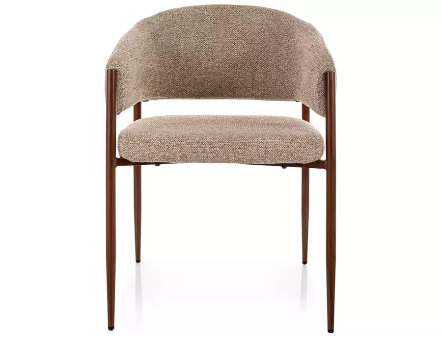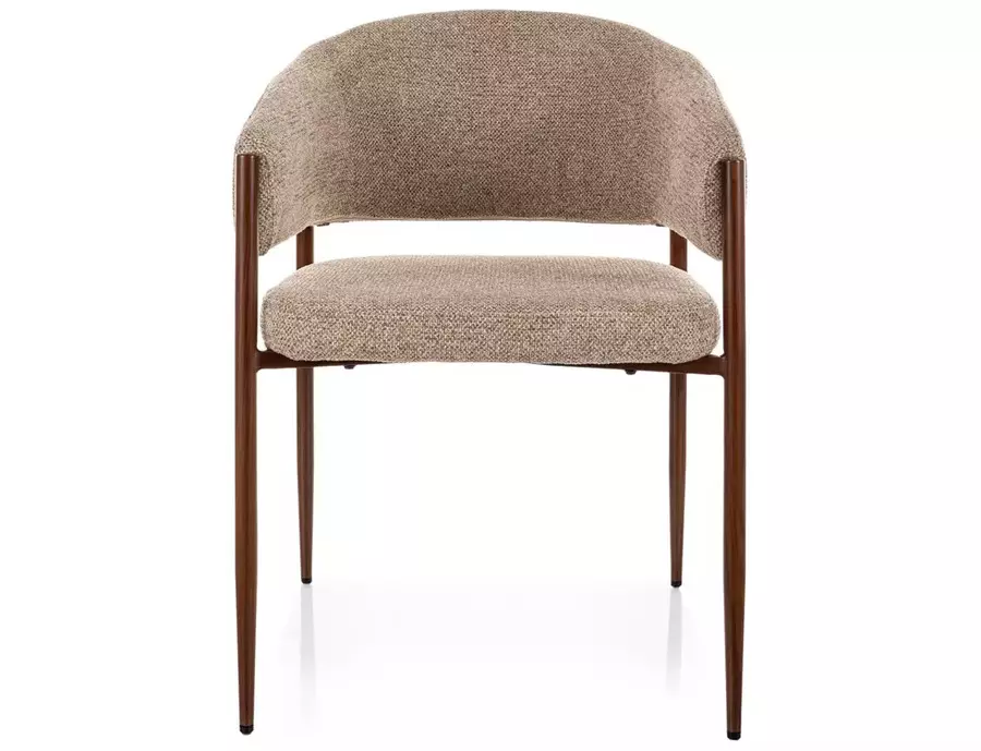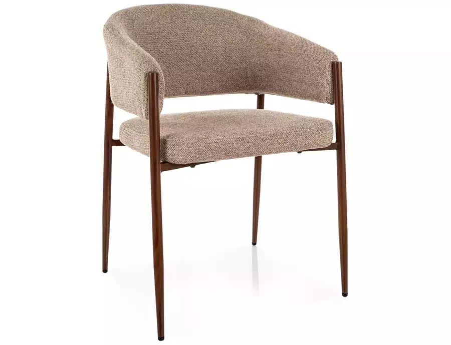 Меката, тапицирана седалка и ергономично оформената облегалка осигуряват висок комфорт дори при продължително седене. Отвореният дизайн на подлакътниците добавя нотка визуална лекота, като същевременно осигурява удобна опора за ръцете. Стабилната метална рамка с матово орех покритие подчертава модерния характер на стола.Допустими са отклонения или несъответствия от действителните цветове на продукта,