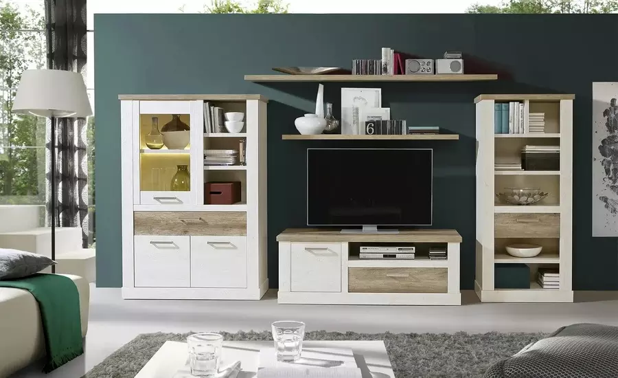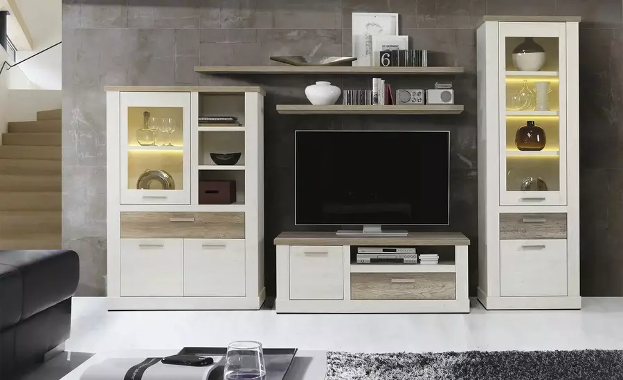 Секционен шкаф ДУРО е перфектният избор за тези, които търсят стил и функционалност в интериора си. Изработен от 18 мм ПДЧ с дървесни мотиви, той носи уют и топлина в дома ви, благодарение на естествения вид на дървесината. Комплектът включва висока витрина, ниска двойна витрина, полица и ТВ шкаф, осигурявайки достатъчно пространство за съхранение на различни предмети и техника. Модулите могат да бъдат монтирани в различни помещения, като не е необходимо да бъдат свързани един за друг. Това го прави изключително гъвкав и подходящ за различни по размер и оформление помещения.