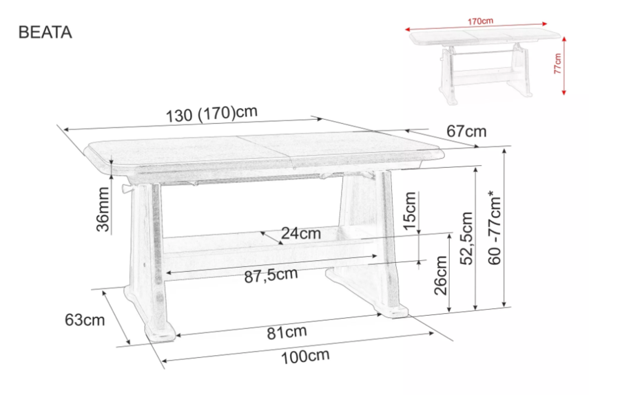 Освен регулиращата се височина, масата БЕАТА предлага и разтегателен механизъм, който увеличава площта на плота, като той може да достигне до 170 см. Това я прави перфектна за домакинства, които често имат нужда от допълнително пространство, но не искат да жертват елегантния дизайн и компактността на масата.