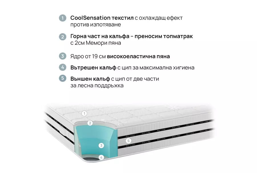 CoolComfort e двулицев матрак със средна твърдост. Ядрото му е от 100% високоеластична пяна и е облечено със сваляем, проветрив, вътрешен калъф с цип, който може да се пере в домашни условия. Външният калъф на матрака е с добавен слой от 2 см мемори пяна за приятно усещане на отмора и отпускане още в първите минути от лягането. Горната му част може да се отдели изцяло и да се използва като преносим топматрак от 100% мемори пяна.
