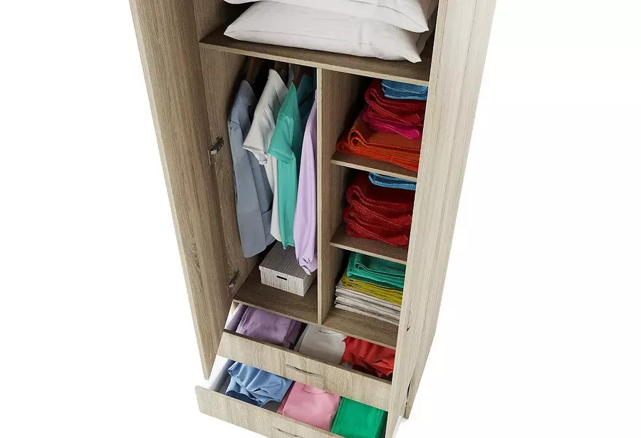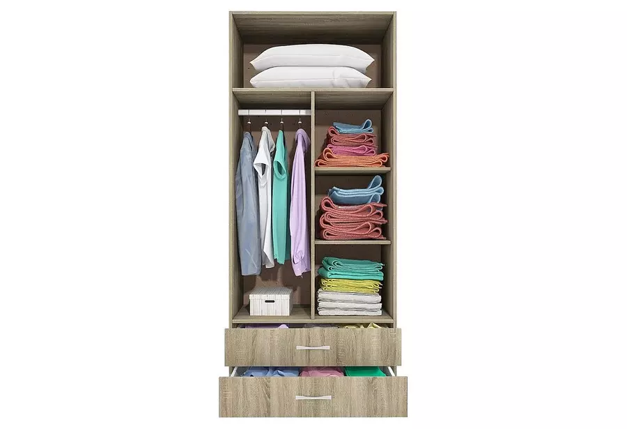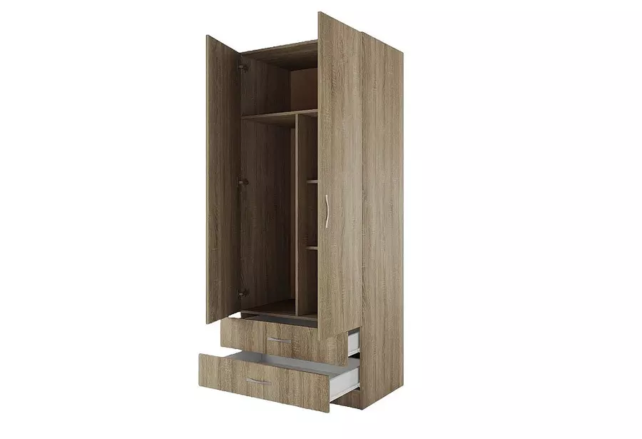 Двукрил гардероб СИТИ 1008 е стилно и практично решение за всяка спалня или антре. Той предлага добре организирано вътрешно пространство с лост за закачалки и два рафта, подходящи за сгънати дрехи, кутии или аксесоари. В долната част се намират две удобни чекмеджета, осигуряващи допълнително място за съхранение. Гардеробът е оборудван с механизъм за плавно затваряне на вратите, което допринася за по-тиха и комфортна употреба. Изработен от качествени материали, моделът се отличава с устойчивост и модерен дизайн, който лесно се вписва в различни интериорни стилове.