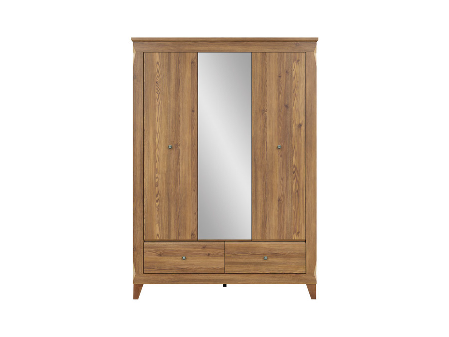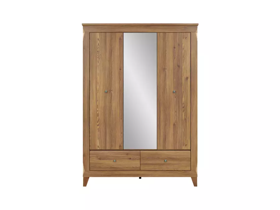 Двe от крилата са оборудвани с лост за закачалки, предоставяйки пространство за окачване на дрехи като палта, костюми и рокли. Третото крило съдържа рафтове, което го прави идеално за съхранение на сгънати дрехи, аксесоари или обувки. Гардеробът е снабден и с чекмедже, което е удобно за съхранение на дребни предмети. Вратите и чекмеджетата имат плавно затваряне, което осигурява по-голямо удобство и комфорт при използване.