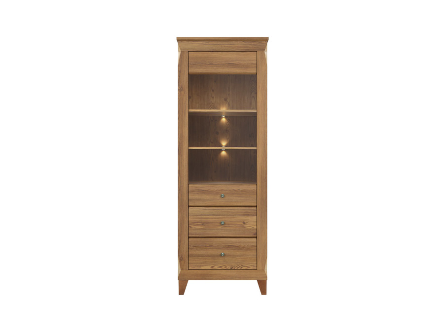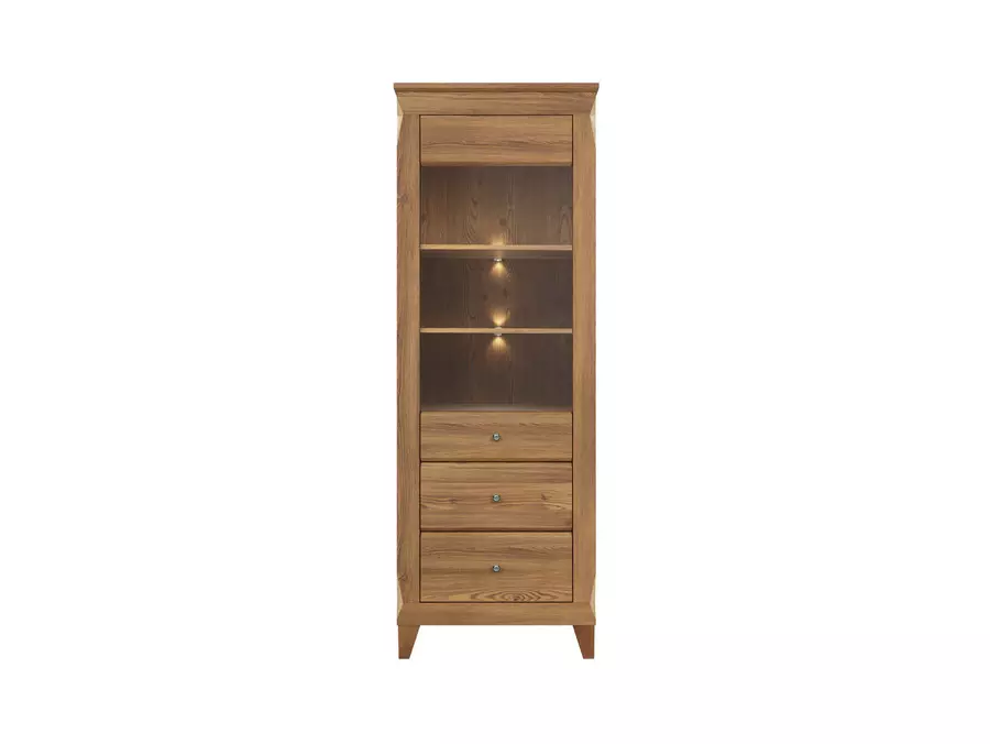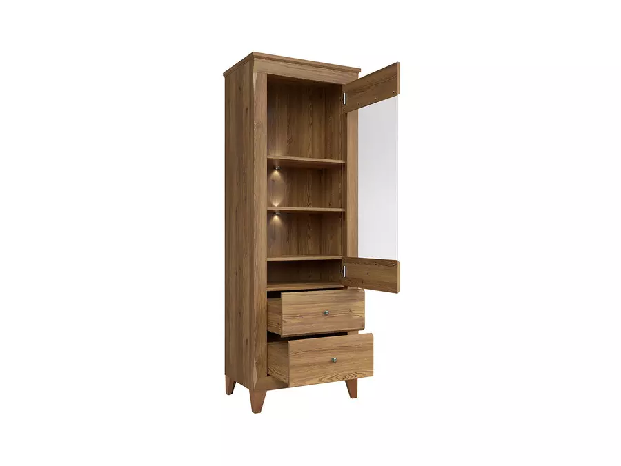 Витрина БЕРГЕН REG1W2S е елегантен и практичен мебелен елемент, който ще добави стил и функционалност към всяка стая. Изработена е от 18 мм ПДЧ и МДФ, с внимание към качеството и детайлите. Витрината разполага с една врата със стъкло, зад която се намират два рафта, осветени с включено LED осветление, което създава уютна атмосфера и акцентира върху съхраняваните предмети. Под стъкленото отделение има две чекмеджета, които осигуряват допълнително пространство за съхранение на по-малки вещи. Моделът е част от колекцията БЕРГЕН и може да бъде комбиниран с останалите мебели от нея за създаване на хармоничен интериор. Вратите и чекмеджетата имат плавно затваряне, което осигурява по-голямо удобство и комфорт при използване.