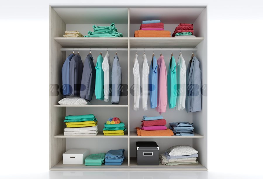 Гардеробът е с плъзгащи врати, които спестяват място и осигуряват лесен достъп до съдържанието. Той предлага достатъчно пространство за съхранение на дрехи и аксесоари, като неговият модерен дизайн се вписва перфектно във всяка спалня.
