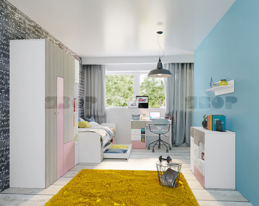 Комплектът включва легло, гардероб, скрин, етажерка и бюро, създавайки пълен и практичен комплект за детската стая. Леглото е предназначено за еднолицев матрак с размери 90х200 см, но чрез подматрачна рамка може да се използва и с двулицев матрак. Под матрака има чекмедже за съхранение на вещи, което предоставя допълнително пространство за организиране на детски дрехи, играчки или книги.