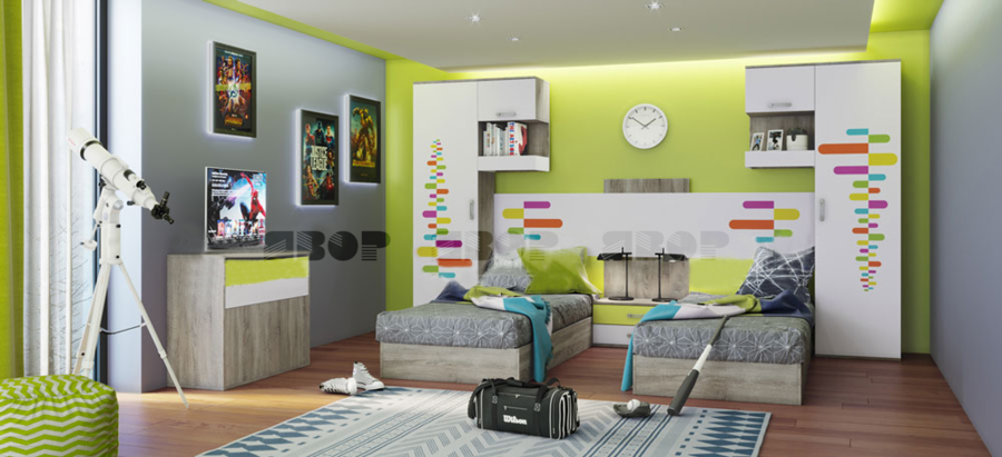 Комплект за детска стая СИТИ 5010 предлага пълно обзавеждане за създаване на уютна и функционална обстановка в детската стая. Комплектът се състои от две легла, скрин и два гардероба, осигурявайки необходимото пространство за съхранение и комфортен сън.