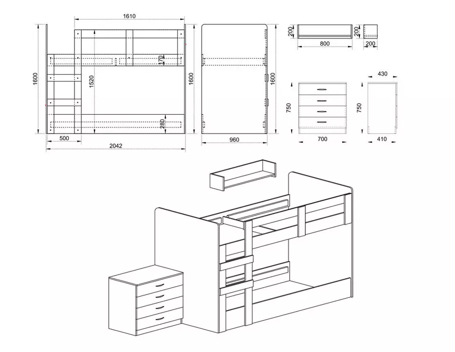 Комплектът за детска стая СИТИ 5015 включва двуетажно легло, етажерка за стена и скрин – идеално решение за максимално използване на пространството. Леглото е предназначено за еднолицев матрак с размер 90x200, като има възможност да се използва и с двулицев матрак чрез подматрачна рамка. Етажерката за стена предлага допълнително място за съхранение и подредба на играчки, книги и други принадлежности. Скринът е практичен и предлага удобен начин за съхранение на лични вещи.
