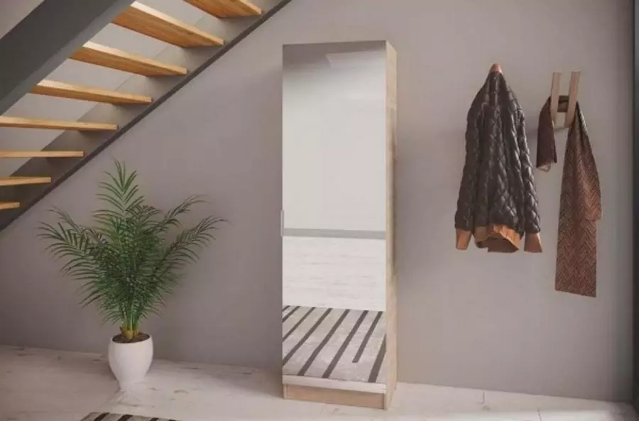 Шкафът разполага с четири рафта, които осигуряват място за съхранение на обувки, както и закачалка за дрехи, което го прави удобен за съхранение на връхни дрехи, шапки или други аксесоари. Предназначен е да побере от 8 до 10 чифта обувки, осигурявайки организирано и подредено пространство. Със своята компактна форма и практични характеристики, шкафът е идеален за помещения с ограничено пространство, като същевременно предлага голям капацитет за съхранение.
