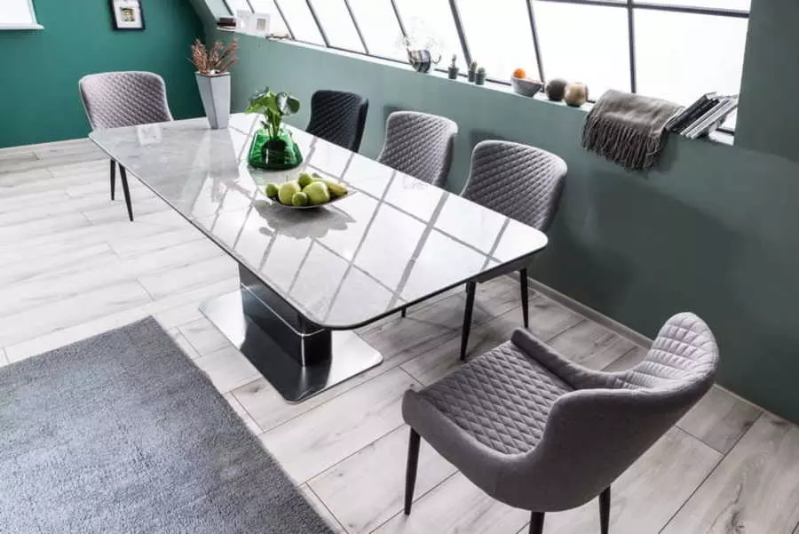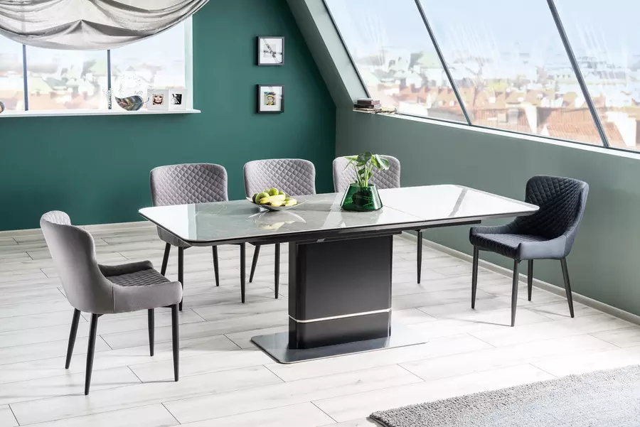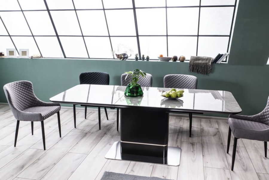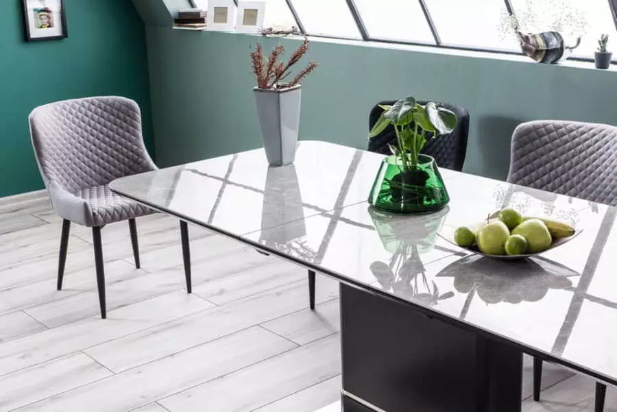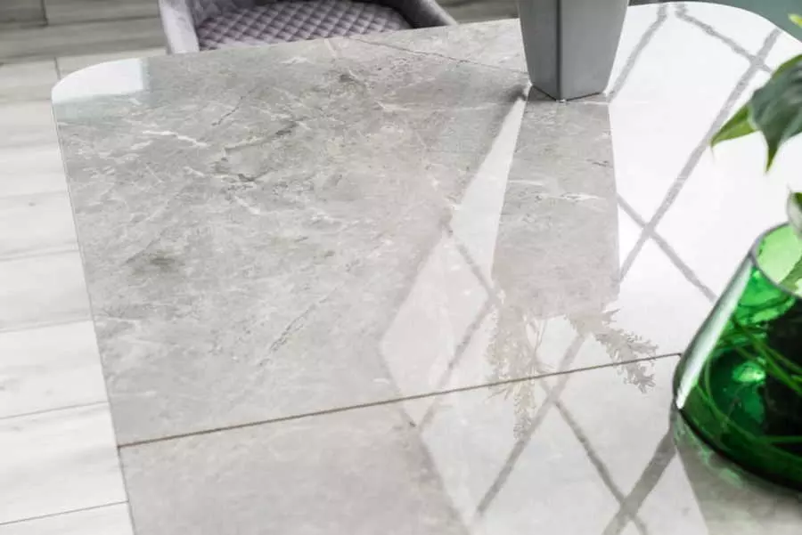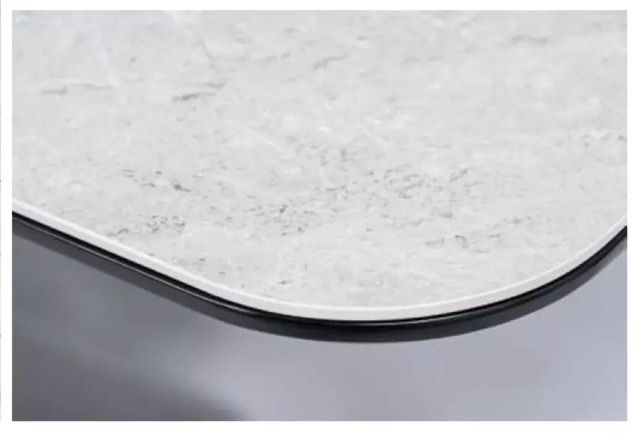 Плотът на масата е изработен от висококачествен МДФ материал с керамично покритие, което не само имитира мрамор с гланцов ефект, но също така предлага изключителна устойчивост на износване, драскотини и замърсявания, което я прави лесна за поддръжка. Керамичният плот съчетава елегантност и практичност, създавайки завършен и стилен вид, който лесно се адаптира към различни интериори.