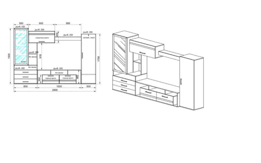 Моделът предлага просторен гардероб, множество чекмеджета за организирано съхранение на вещи, както и стъклена врата с механизъм „Push to open“, осигуряващ лесно и безшумно отваряне. Компактният, но функционален дизайн на секцията позволява оптимално използване на пространството, като същевременно придава модерен и изчистен вид на помещението.