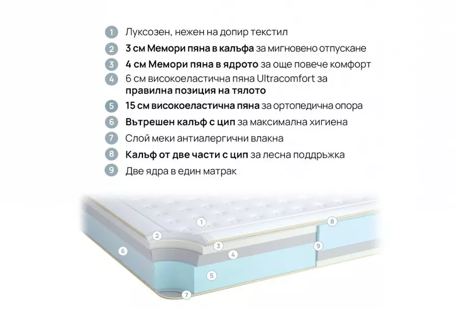 Високоеластична пяна - предоставя стабилна опора в основните точки на контакт с матрака – рамене, таз и крака. Осигурява правилна позиция на сън с изправен гръбначен стълб, без изкривявания и усуквания.