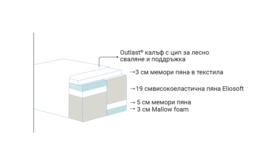 Модерен, мек матрак с трипластовото ядро от мемори, високоеластична пяна и пяна Mallow с екстракт от билката малва.