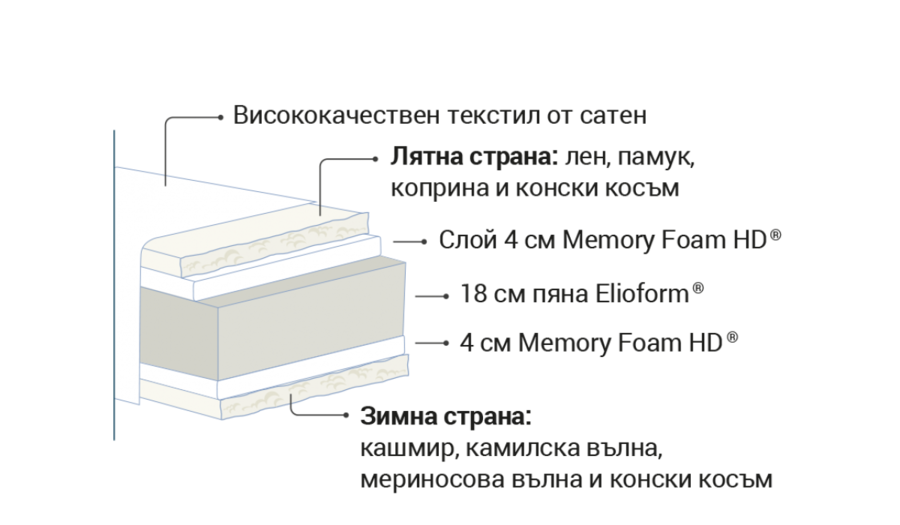 Лятната е от висококачествен текстил, който предлага прохлада чрез състава си от памук, лен и коприна. Най-горният слой на текстила е от премиум сатен. Тези материали са естествен антиалерген с изключителна мекота и издръжливост и висока абсорбираща способност, която не позволява задържането на влага.