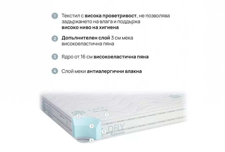 Антиалергичният текстил осигурява суха среда за сън и предпазва от задържане на влага в матрака. Високата проветривост позволява постоянна циркулация на въздух и възпрепятства задържането на прах.
