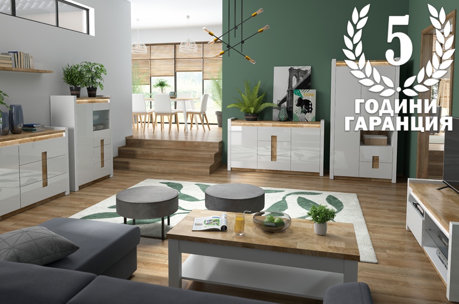 Комплектът включва множество мебели, които осигуряват достатъчно място за съхранение и практично организиране на вещите в дневната. Плавното затваряне на вратите и чекмеджетата гарантира дълготрайна издръжливост и комфорт при ползване, като предотвратява износването и шума.
