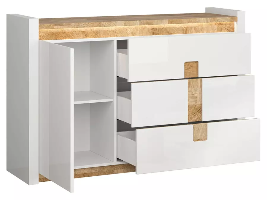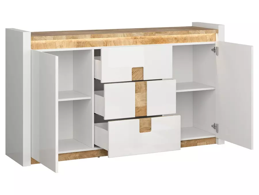 Комбинацията от дървесен ефект и бял гланц придава на мебелите стилен и съвременен вид, който лесно се вписва във всякакъв интериор. Включеното LED осветление в комплекта не само подчертава красотата на мебелите, но и създава уютна и привлекателна атмосфера в помещението.