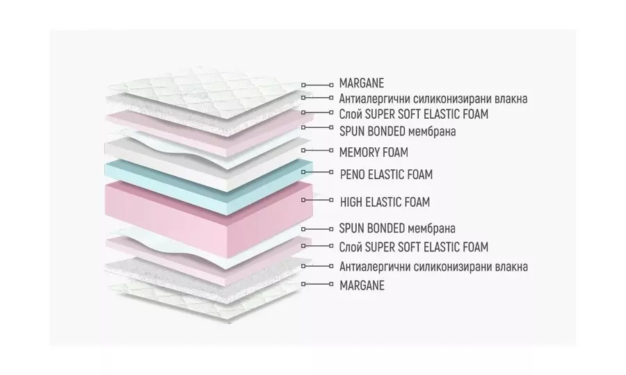 Ядро от високоеластична Eliocell пяна: Сърцевината на матрака Лаго е изградена от специална високоеластична пяна Eliocell, която осигурява стабилна и гъвкава опора. Тази пяна е известна с високата си плътност и еластичност, което гарантира дълготрайност и устойчивост на деформации. Eliocell пяната се грижи за правилното подравняване на гръбначния стълб, осигурявайки ортопедичен ефект и предотвратяване на напрежението в тялото.