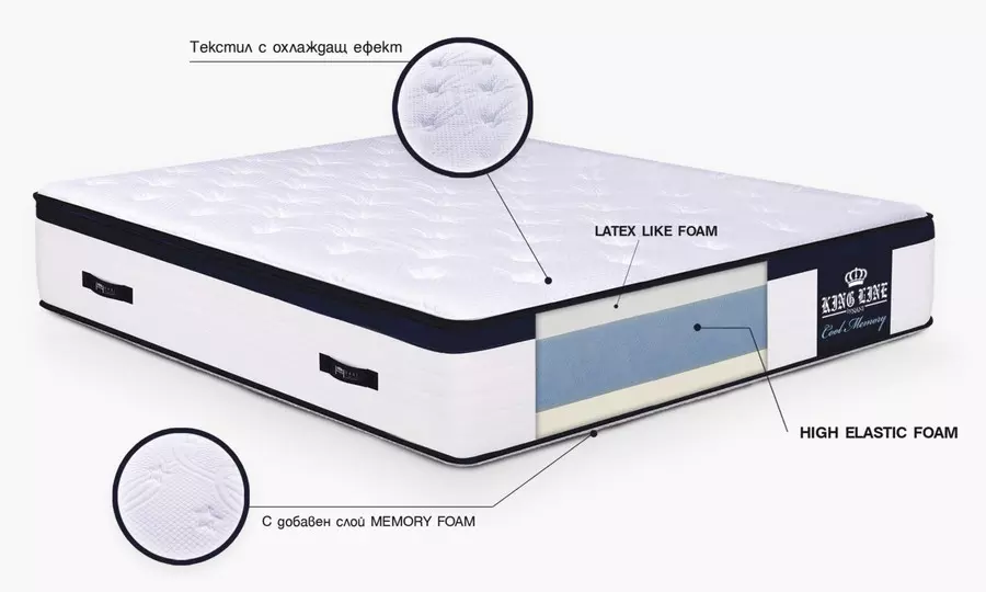 Ядро от високоеластична пяна: KING LINE Cool Memory е изграден с високоеластична пяна, която осигурява надеждна и стабилна поддръжка на тялото. Пяната е проектирана да предоставя отлична ортопедична поддръжка и да запазва своята форма и свойства с времето. Висококачествената пяна Eliocell е известна със своята дълготрайност и издръжливост.