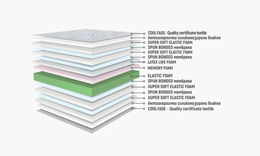 Мемори пяна за персонализиран комфорт: В горния слой на матрака е разположена термоактивна мемори пяна, която се адаптира към телесната температура и формата на тялото. Тази пяна облекчава точките на напрежение, като осигурява индивидуализирана опора и намалява натиска върху ставите и мускулите. Мемори пяната създава усещане за мекота и комфорт, което позволява на тялото да се отпусне напълно.