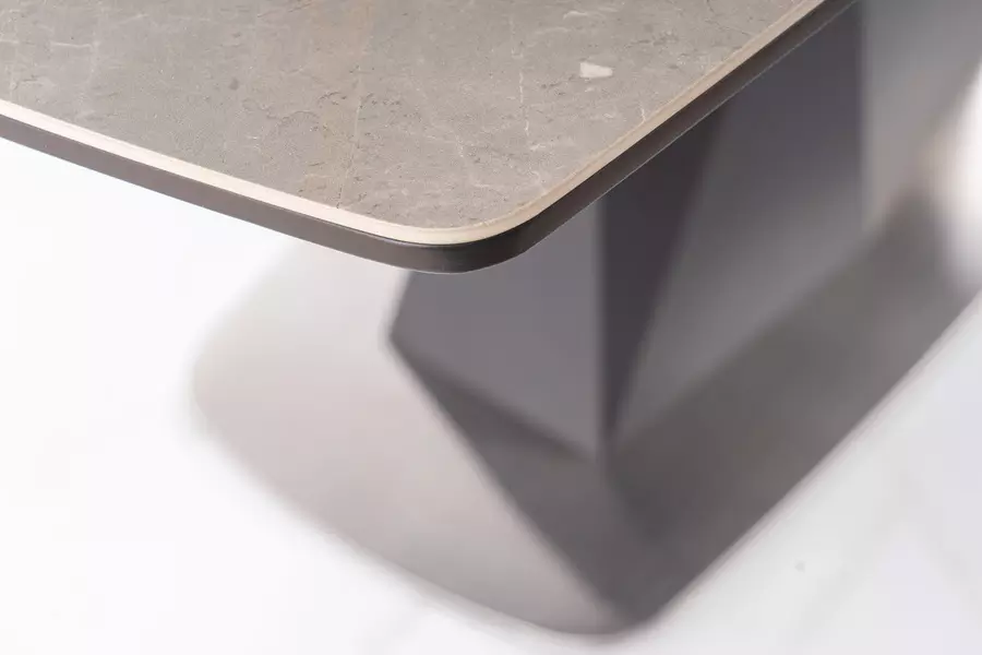 Плотът е изработен от висококачествена керамика, което му придава модерна и луксозна визия, като същевременно осигурява устойчивост на повреди, топлина и лесна поддръжка. Здравата основа е проектирана с уникален геометричен дизайн и изработена от метал, което гарантира стабилност и дълготрайност. Тази комбинация от материали създава хармоничен баланс между естетика и практичност.