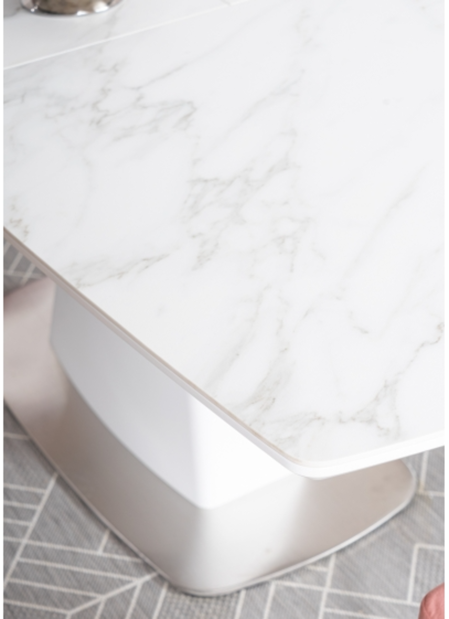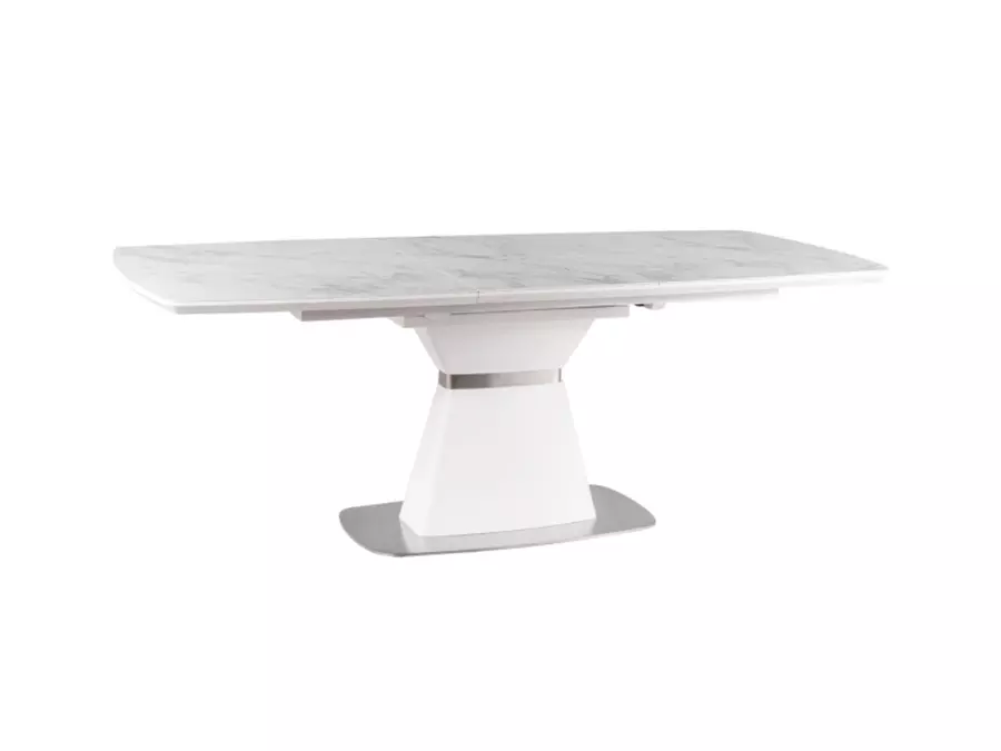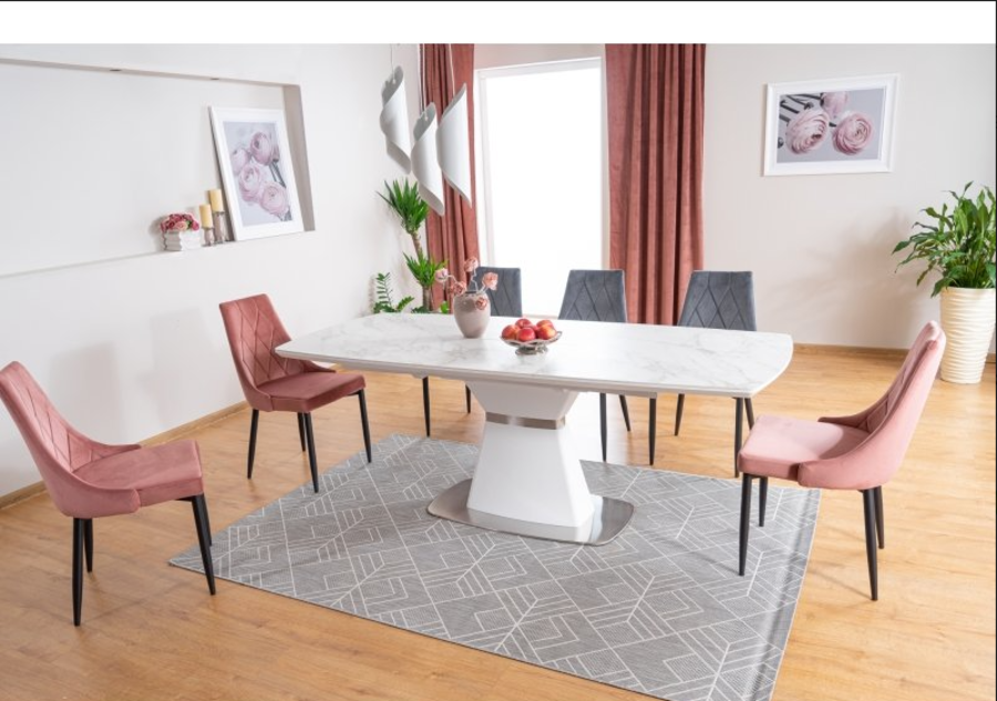 Трапезна маса с разтегателен механизъм САТУРН е съчетание на елегантен дизайн и висока функционалност, което я прави идеалния избор за всяко модерно жилище. Плотът е изработен от висококачествен материал, наподобяващ мрамор, който придава луксозен и изискан вид на масата. Той е устойчив на надрасквания и лесен за поддръжка, което гарантира дългосрочна употреба и запазване на безупречния ѝ вид.