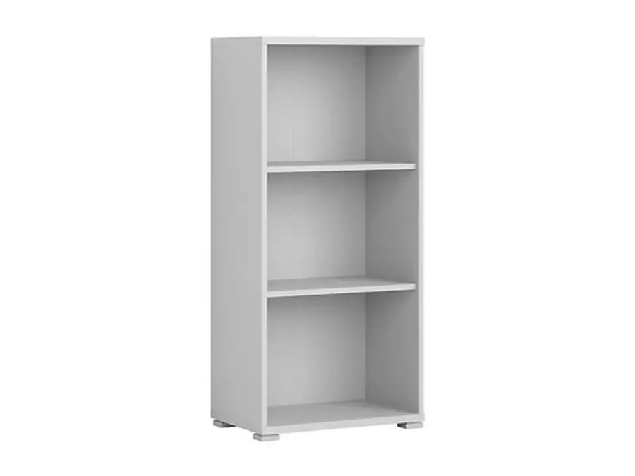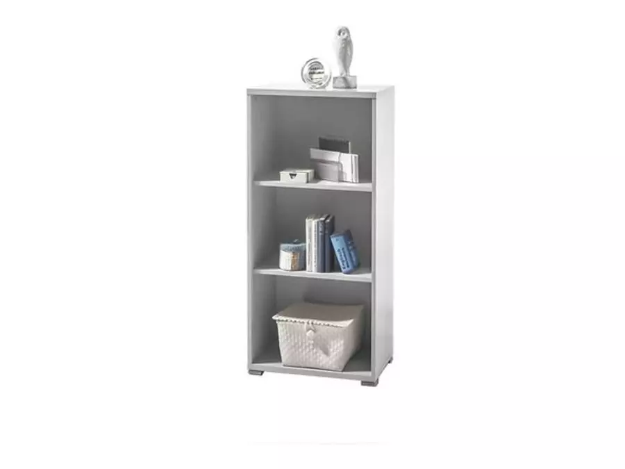 Етажерка ОФИС ЛУКС с два рафта и отворено пространство за съхранение. Корпусът е изработен от ПДЧ с покритие от меламин в светлосив цвят.
