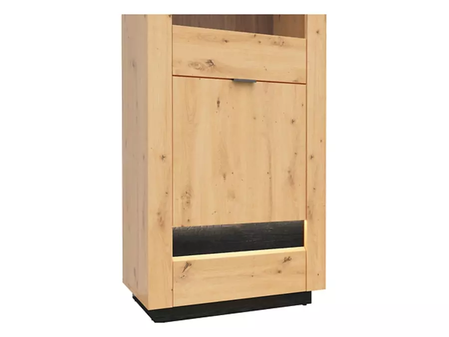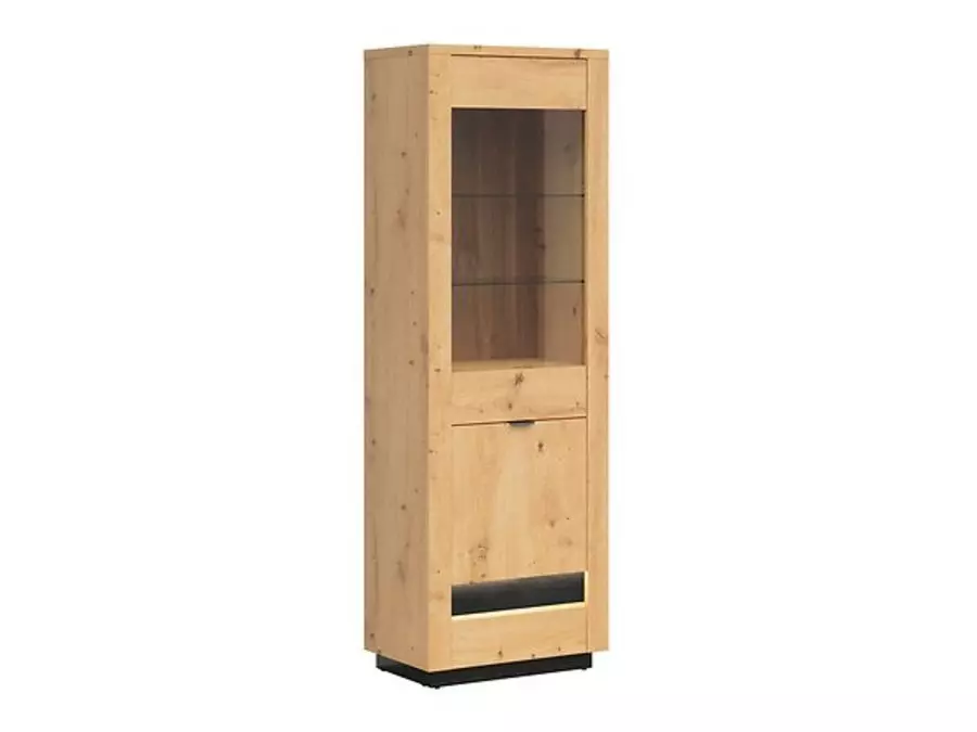 Витрина Остия е модерно и елегантно решение за съхранение и декорация, което съчетава стил, функционалност и високо качество на изработка. Изработена от устойчиви материали – МДФ и ПДЧ, витрината впечатлява със стабилна конструкция и изтънчен дизайн. Цветовата комбинация дъб артизан и черен придава характерен контраст и съвременно излъчване, което се вписва отлично в модерни, индустриални или скандинавски интериори.