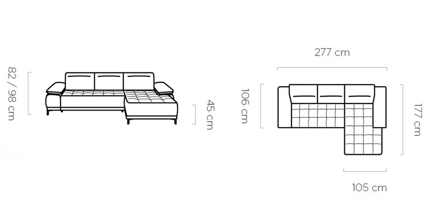 Височина на седалаката: 45 см. Височина без механизмите на облегалката: 82 см. Широчина на лежанката: 105 см. Моделът е изработен от висококачествен дунапрен и зиг заг пружини.