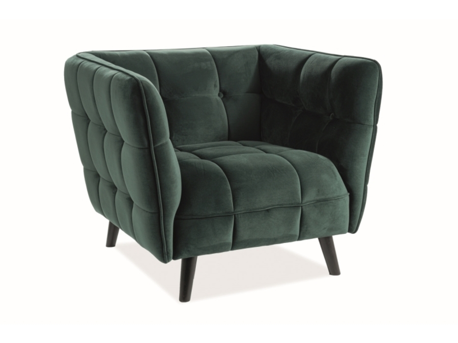 Фотьойл КАСТЕЛО 1 е тапициран с кадифена дамаска в син цвят, а краката на фотьойла са дървени.