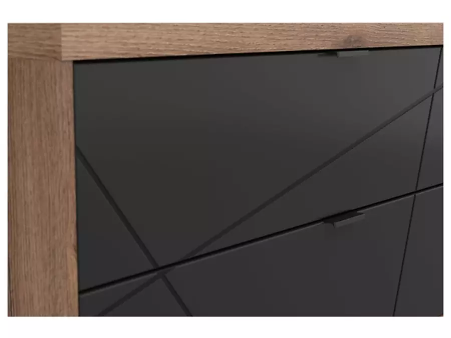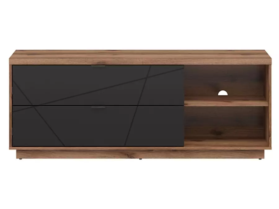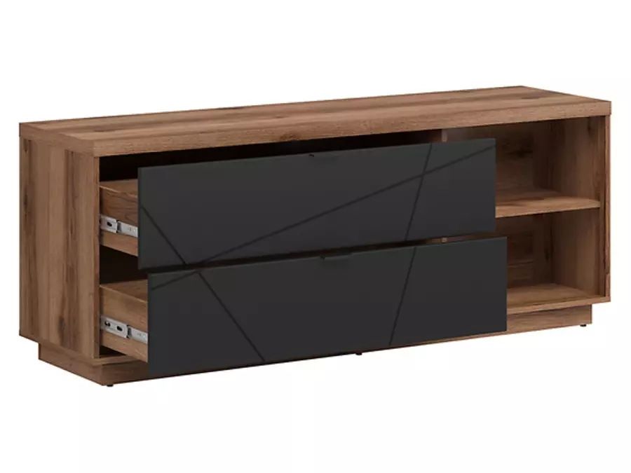Тв шкаф ФОРН е модерно и функционално решение за всяка всекидневна, което съчетава изчистен дизайн и практичност. Изработен от висококачествено ПДЧ, този модел се отличава с устойчивост и стабилност, осигуряващи дълъг живот на изделието. Благодарение на добре обмислената конструкция, шкафът предлага удобно разпределение на пространството – две практични чекмеджета, подходящи за съхранение на дистанционни, документи или други аксесоари, и два открити рафта, идеални за разполагане на мултимедийни устройства като декодери, игрови конзоли или декоративни елементи.