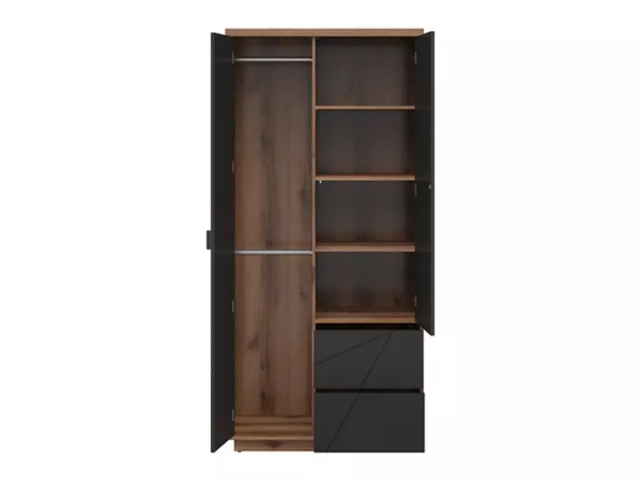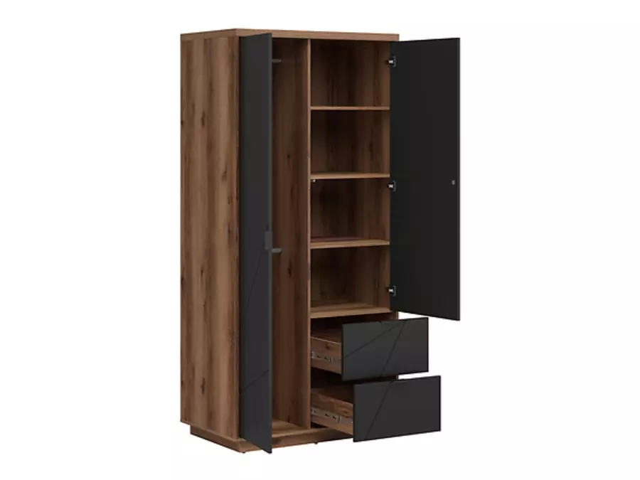 Вътрешното разпределение е thoughtfully организирано, за да осигури удобство при подреждане на дрехи и аксесоари. Гардероб Форн SZF2D2S разполага с просторна зона за закачалки, подходяща за връхни дрехи, ризи и официални облекла, както и с два практични долни шкафа с чекмеджета, които предоставят допълнително място за сгънати дрехи, бельо или малки предмети от ежедневието. Двукрилите врати се отварят плавно и осигуряват лесен и бърз достъп до цялото съдържание.