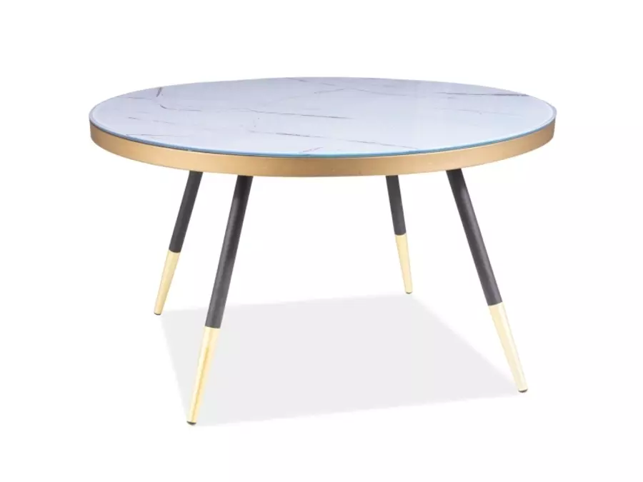 Изработена от метална основа в черен и златист цвят и закалено стъкло с бял мраморен ефект.