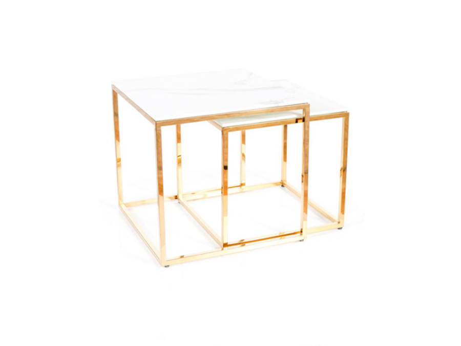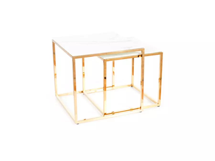Изработена от неръждаема стомана в златист цвят и плот от закалено стъкло в бял цвят с мраморен ефект. Размери на по-малката маса: Широчина: 40 см. Дълбочина: 40 см. Височина: 38 см.