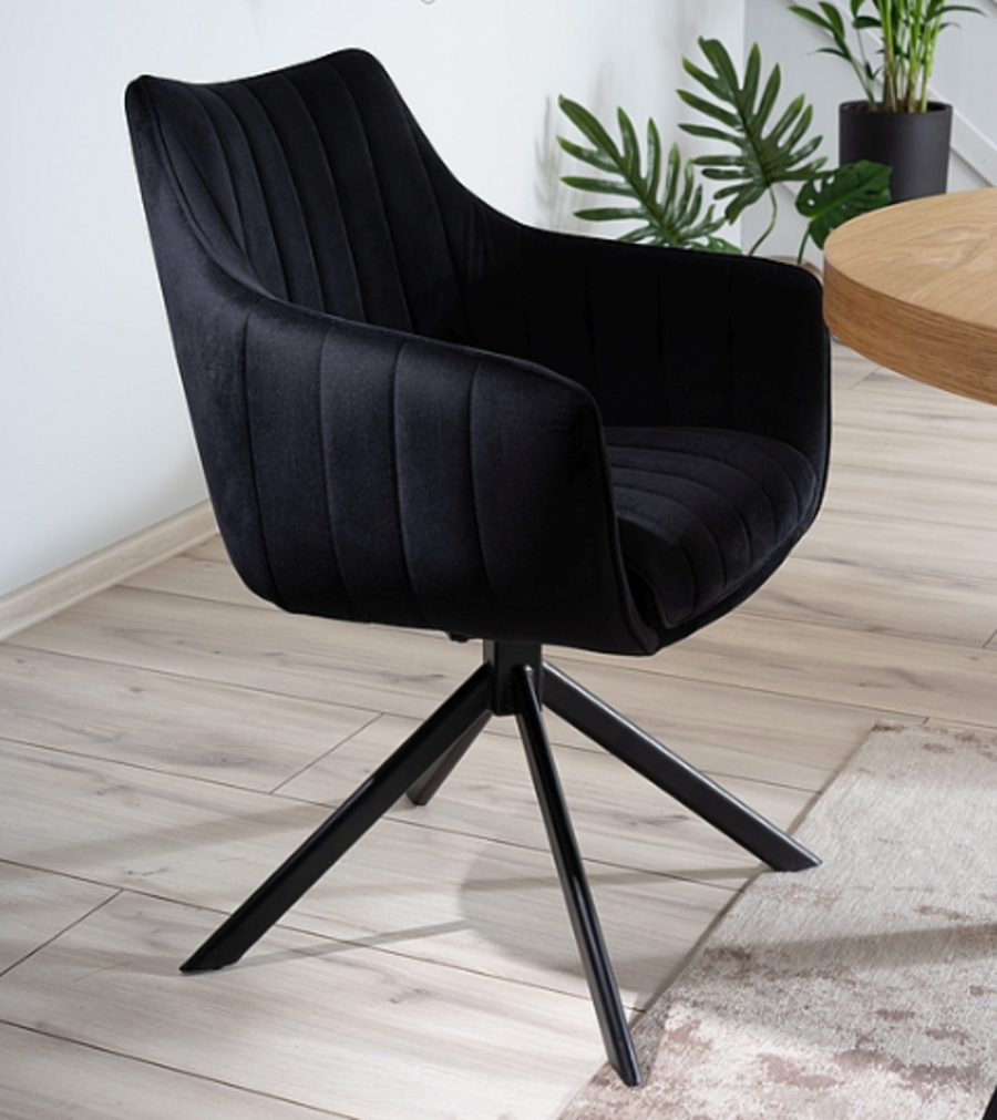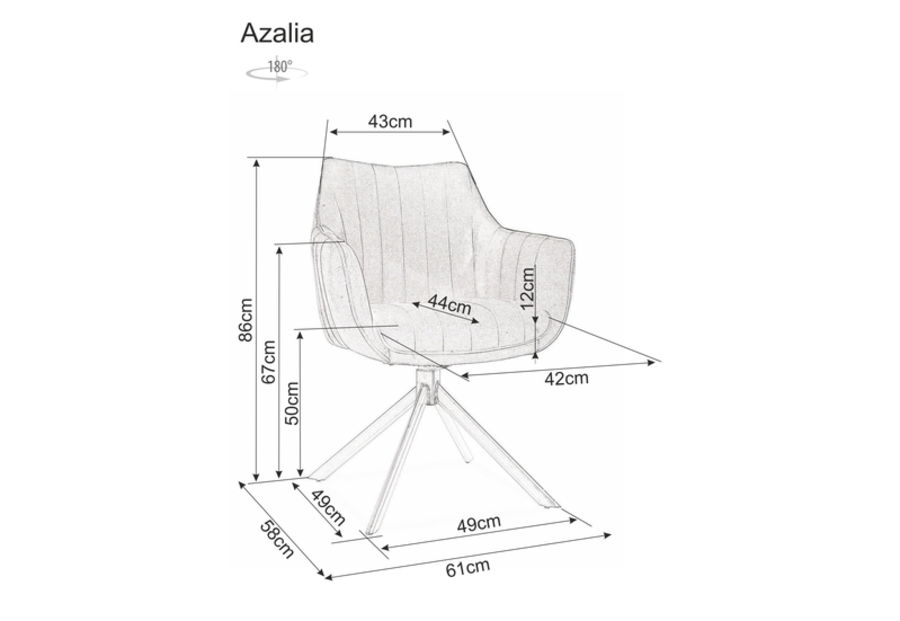 Кресло АЗАЛИЯ е стилно и практично решение за всяка модерна трапезария или всекидневна. Със своя изчистен дизайн и висококачествена изработка, то придава елегантност и функционалност на интериора. Тапицираната седалка осигурява комфорт при продължително използване, а вграденият механизъм за въртене на 180 градуса позволява удобно завъртане, като креслото автоматично се връща в изходна позиция. Здравата метална основа с черно матово покритие гарантира стабилност и дълготрайност, дори при интензивно натоварване.