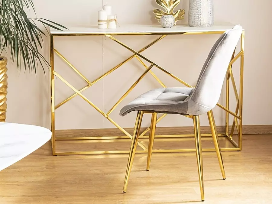 Трапезният стол ШИК е стилно и модерно решение, което съчетава комфорт и функционалност. Седалката е изработена от плътна пяна и висококачествена материя тип кадифе, осигуряваща мекота и удобство при продължително използване. Златните крака добавят елегантност и гарантират стабилност и дълготрайност. Максималното натоварване на стола е 120 кг, което го прави надежден избор за ежедневна употреба. Идеален е за трапезарии, кухни или модерни интериорни пространства, добавяйки изтънченост и стил към всяка обстановка.