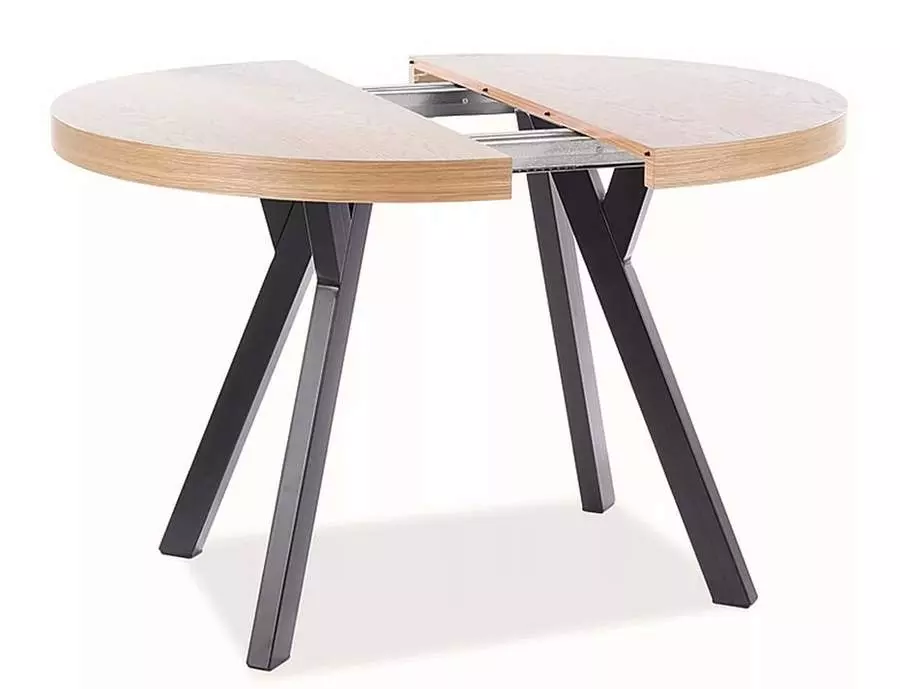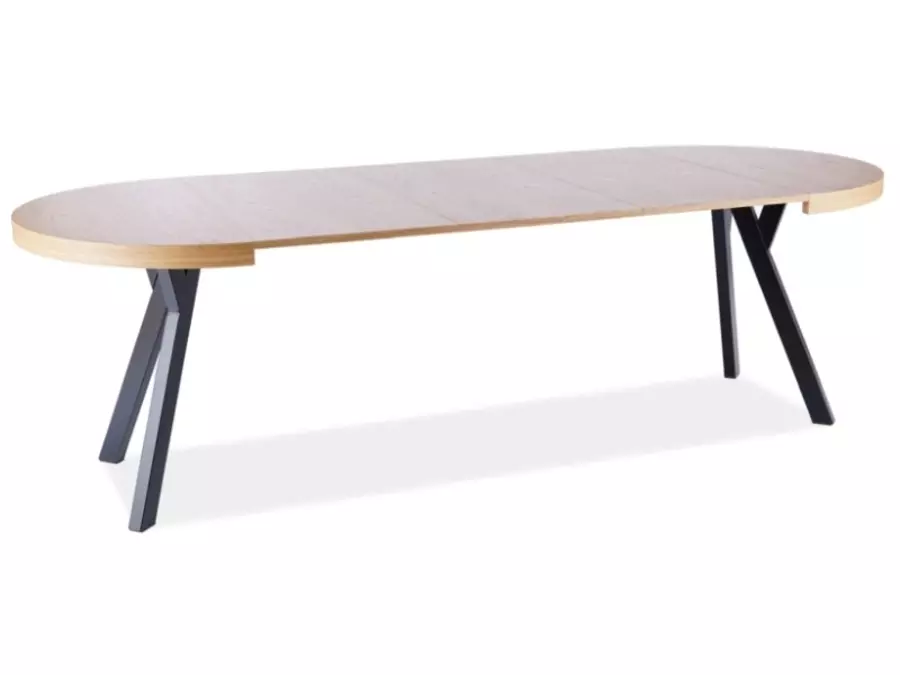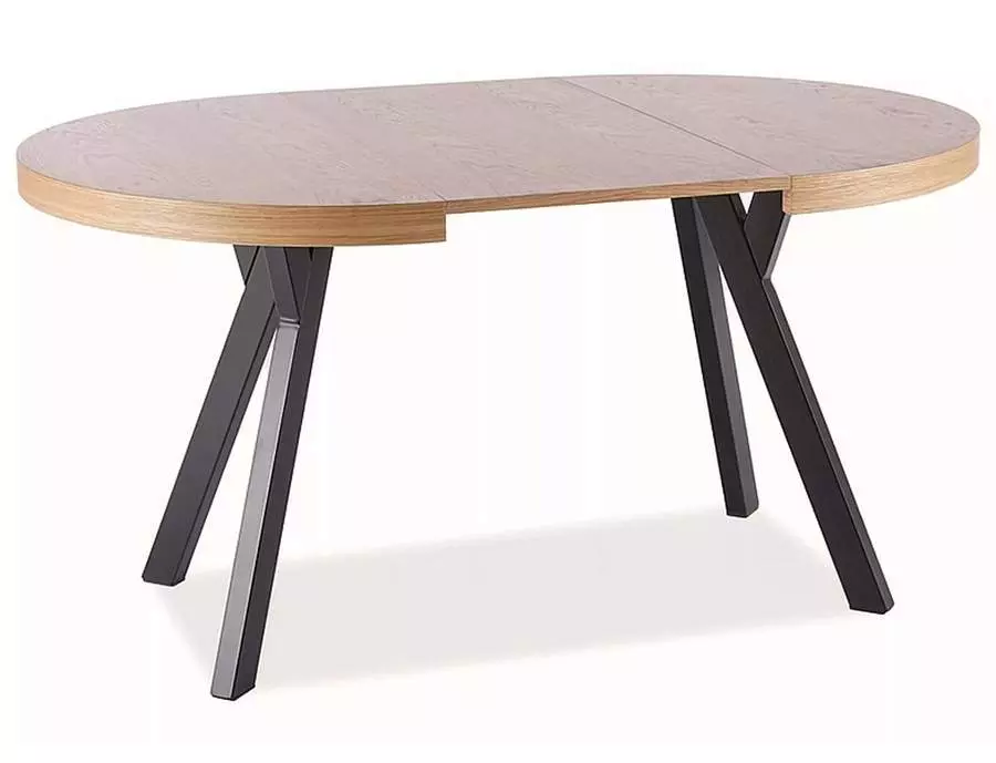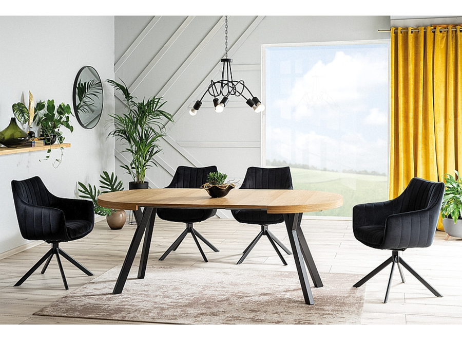 Плотът е изработен от МДФ с естествен фурнир в стилен дъбов цвят, който придава топлина и изтънченост на вашето пространство. Краката на масата са метални, прахово боядисани в черен цвят, осигуряващи стабилност и устойчивост, като същевременно добавят модерен акцент към дизайна.
