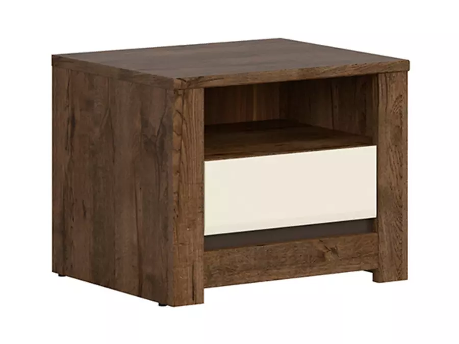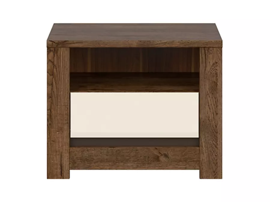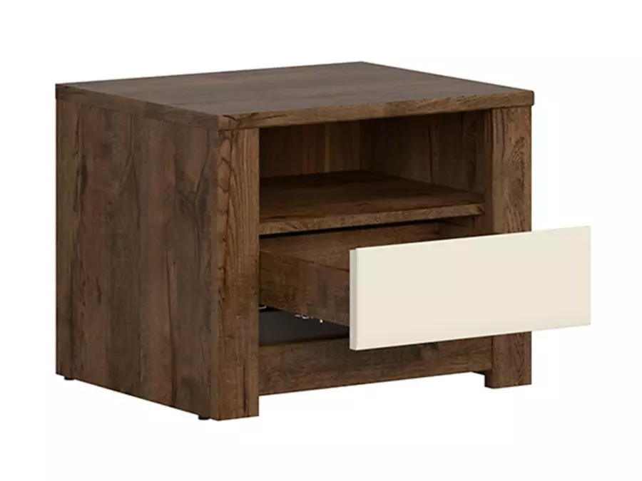 Нощно шкафче Русо с елегантен и функционален дизайн, което е идеално допълнение за спалнята. То комбинира модерен стил с практичност, съчетавайки топлия дървесен декор и светъл гланцов акцент.