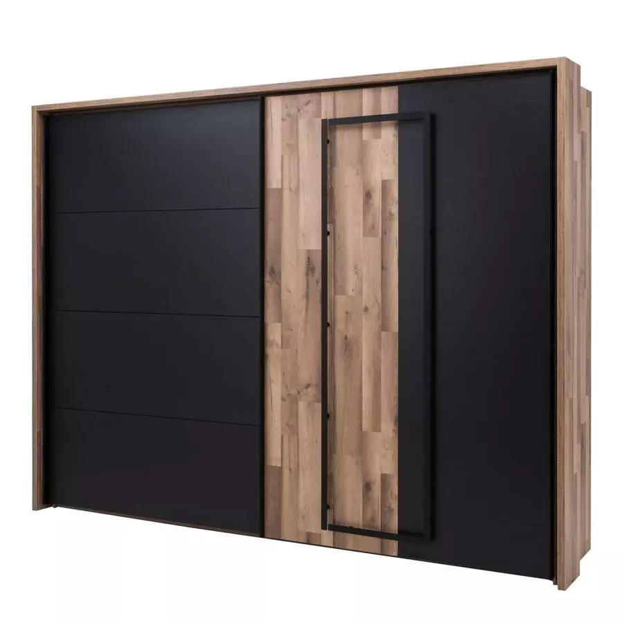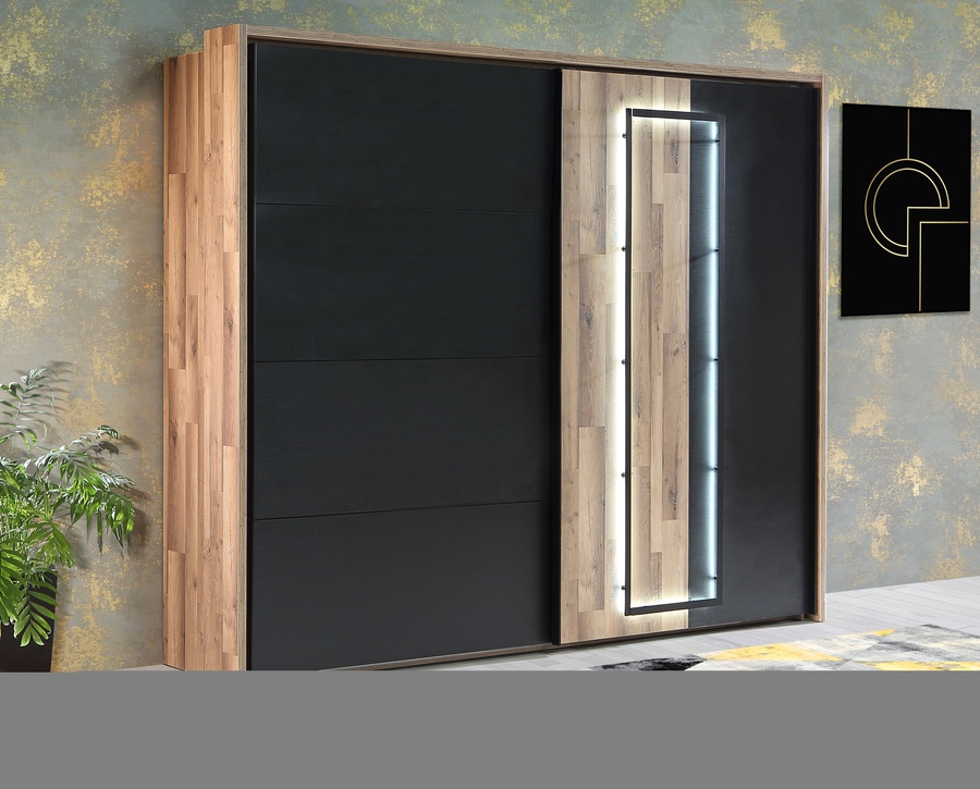 Гардероб СИРИУС с две плъзгащи врати е функционално и стилно решение за съвременния дом. Състои се от три крила, които предлагат добре организирано вътрешно пространство: двете крила разполагат с рафт и лост за дрехи под него, докато третото включва три просторни рафта за допълнително съхранение. Вграденото LED осветление придава модерен вид и осигурява удобство при използване. Изработен от качествени материали, този гардероб съчетава практичност, издръжливост и изчистен дизайн, подходящ за всякакъв интериор.