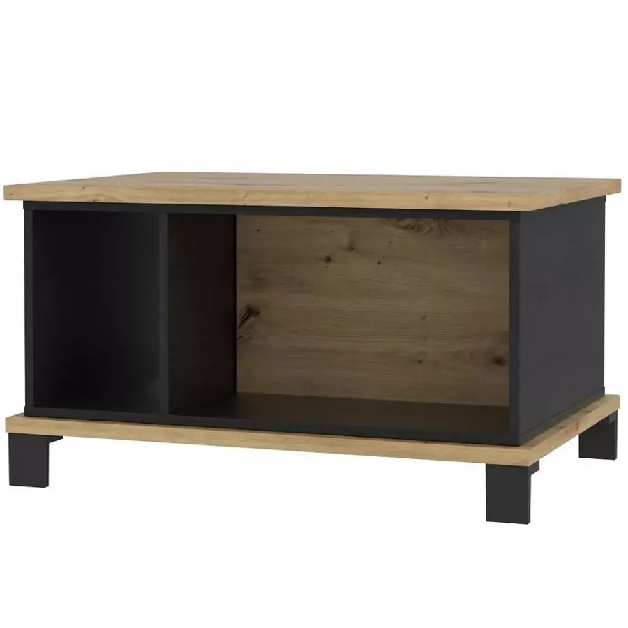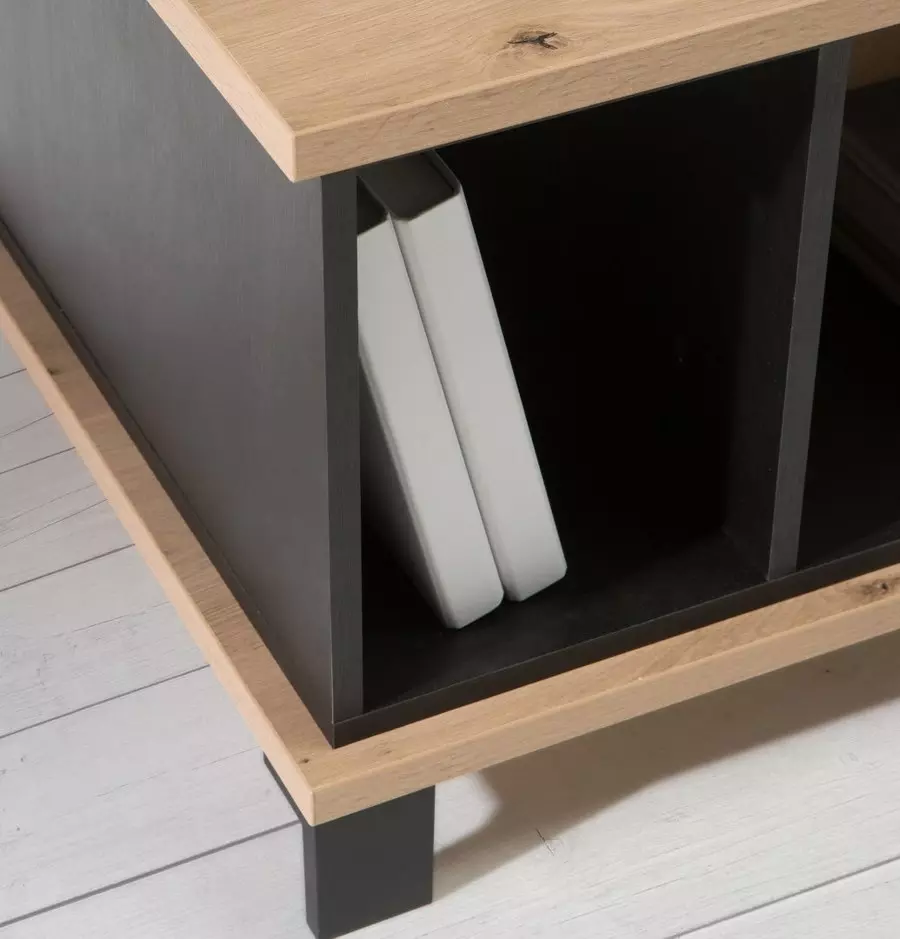 Масата предлага достатъчно място за подреждане на книги, напитки или други декоративни елементи, като допълнителният отворен рафт осигурява удобство за съхранение на аксесоари. Пространството е практично организирано, като същевременно запазва минималистичния и модерен вид на мебелта. С този елемент ще добавите функционалност и стил в дома си.
