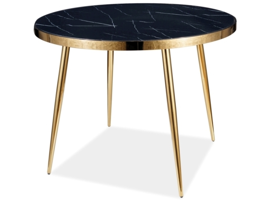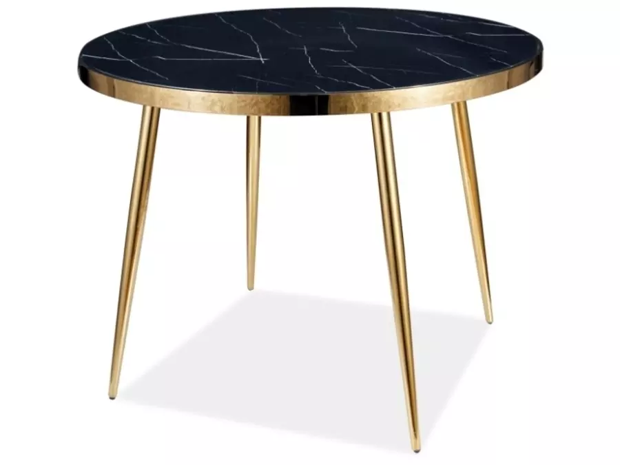 Трапезна маса КАЛВИН е символ на изискан стил и изтънчена естетика. С кръглия си плот, изработен от закалено стъкло с деликатен мраморен ефект, тя създава усещане за лекота и елегантност. Златистата рамка около плота подчертава модерния дизайн, добавяйки нотка на лукс и блясък.