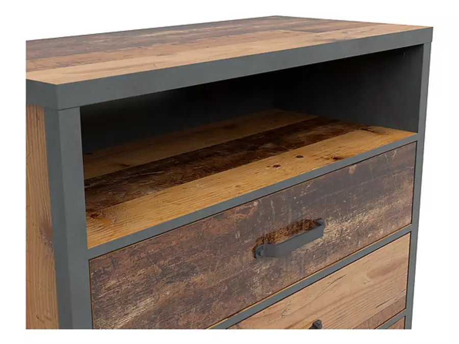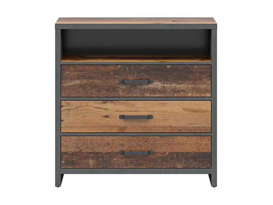 Моделът разполага с три плавно отварящи се чекмеджета, които предоставят удобно място за съхранение на дрехи, аксесоари или други принадлежности. Над тях е разположен един отворен рафт, подходящ за книги, декорации или вещи, които искате да бъдат винаги под ръка. Компактните размери на скрина – 90см ширина, 91см височина и 40см дълбочина – го правят подходящ за спални, дневни или детски стаи, без да заема излишно пространство.